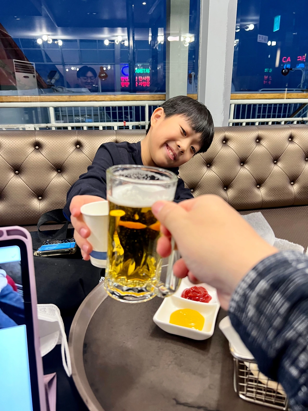 카페에서 여행 첫날을 기념하며 '짠!' 건강하고 재미있게 일본여행 재미있게 합시다. 아들~~~