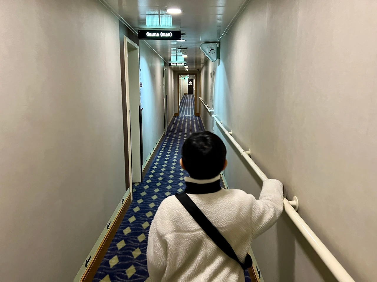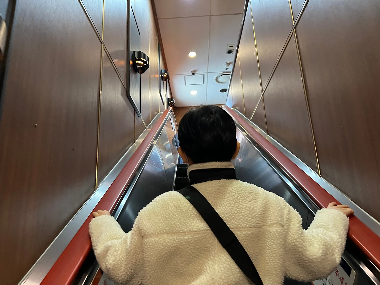 '팬스타드림호' 내부에 에스컬레이터가 있네요. 올라갑니다. 로비는 어떨까요?
