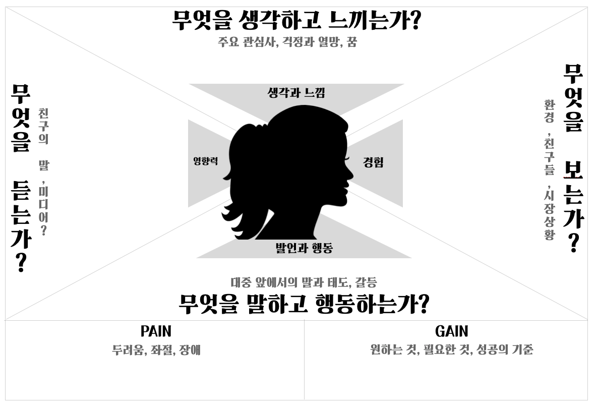 해당 페르소나가 제품의 선택에 무엇을 고려할까요? 안전? 디자인? 가벼움? 기능? 페르소나는 무엇을 걱정하며, 가성비와 가심비 중 무엇에 중점을 둘까요? 또 페르소나는 누구에게 영향을 받을까요? 친구? SNS? 연예인? 그리고 페르소나는 자신의 경험을 공유하는 편인지, 공유한다면 어떤 채널을 선호하는지 등등, 디테일한 요소들을 고려하여 전략이 수립되는 것입니다. 공감지도 (Empathy map)을 활용하면 페르소나에 대하여 깊이 있는 이해를 하는데 도움이 됩니다.