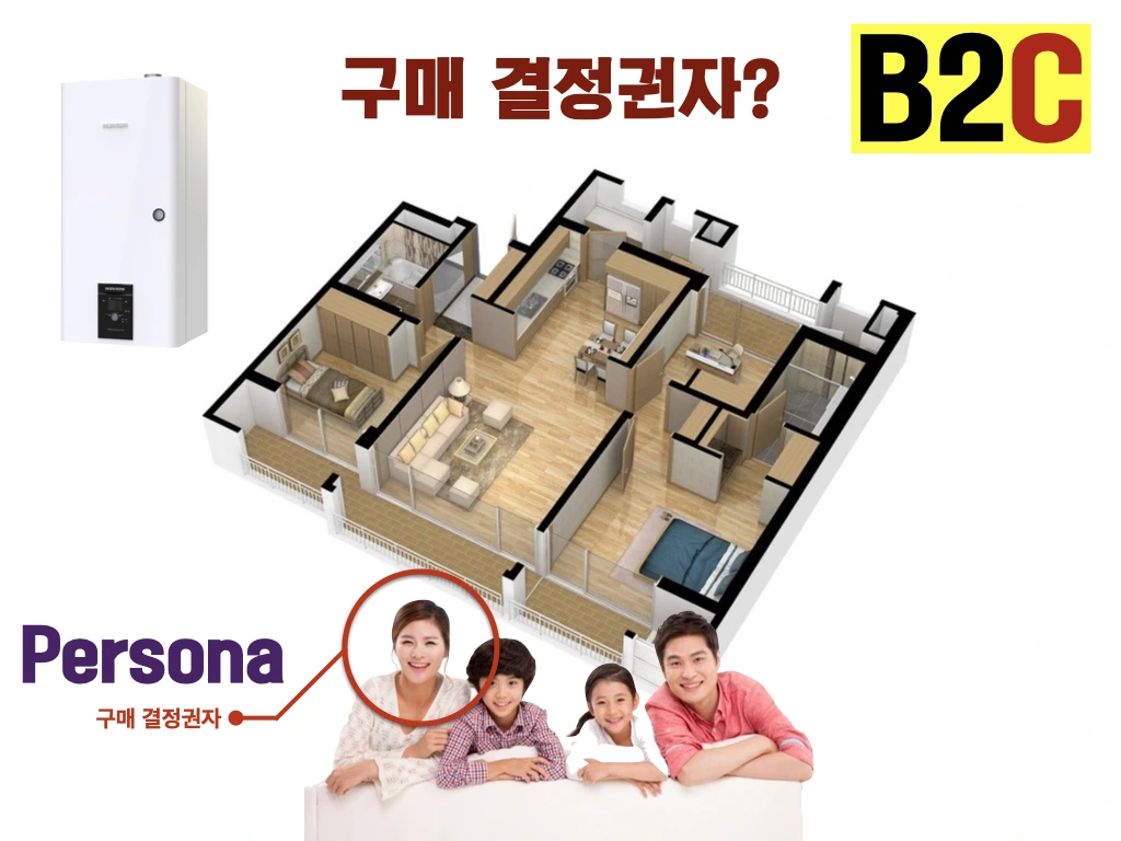특히 B2C 마케팅에서 그 중요성이 더해지는데, 이 페르소나를 추출해낼 수 있다면 필요한 전략이 무엇인지 자연적으로 파악할 수 있기 때문입니다. 자, 앞에서 나온 고장 난 보일러를 교체해야 하는 집을 상상해보세요. 부부와 2명의 자녀를 둔 4인 가족, 32평의 아파트에서 살아가는 평균적인 가정이 있습니다. 이들 모두 보일러의 '사용자, User' 역할을 하겠죠? 그렇다면 '구매결정권자, Decider'는 누구일까요? B2C 마케팅 전략을 수립해야 한다면, 누구에게 어필할 수 있는 전략을 짜야할까요?