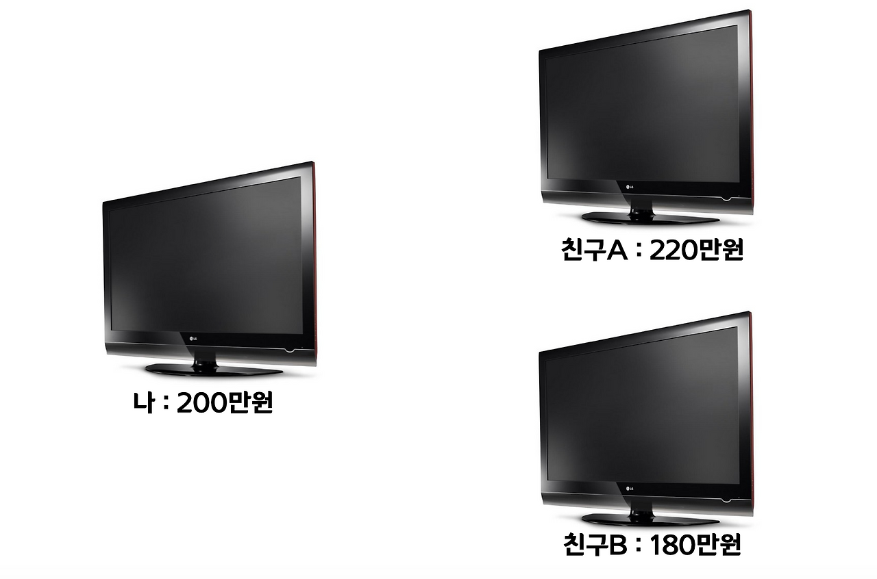 2주일뒤 친구A가 똑같은 모델의 TV를 전자제품 매장에서 샀는데 220만원에 샀다고 하는 말을 들었습니다. 그 때 여러분들의 기분은 어떠할까요? 살짝 안스럽긴 하겠지만 자신이 더 현명하게 그리고 저렴하게 구입했다는 자부심에 기분이 좋아지겠죠. 3주일뒤 친구B가 똑같은 모델의 TV를 직구로 구매했는데 180만원에 샀다고 하는 말을 들었습니다. 그 때 여러분들의 기분은 어떠할까요? 나쁠겁니다. 처음엔 그런 방법을 몰랐던 자신에게 화가 나고, 시간이 좀 지나면 그런 방법을 알려주지 않은 친구B에게 화가 나고 나중엔 20만원이면 무엇을 사거나 할 수 있었다는 생각에 또 화가 날겁니다.