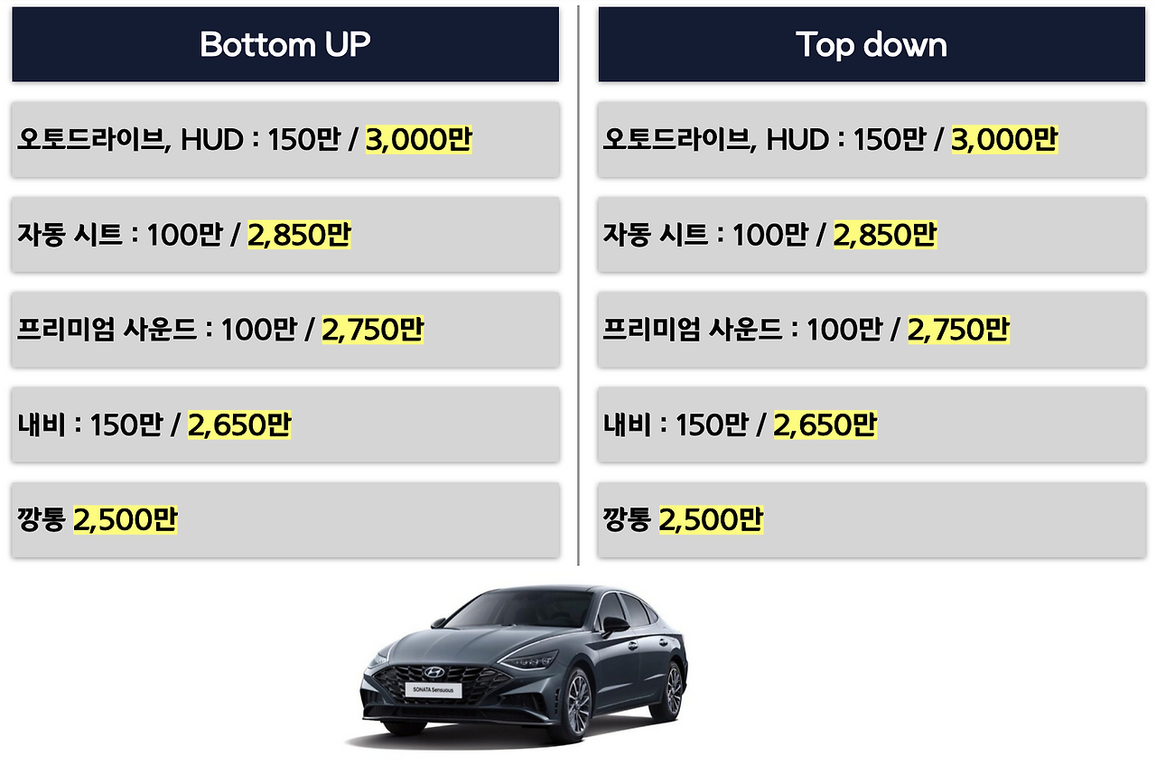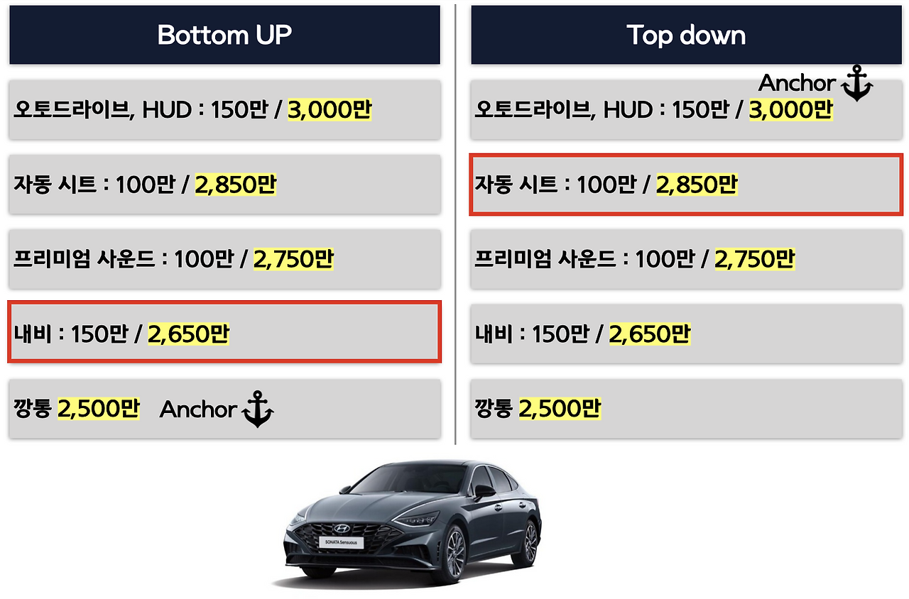 여러분은 현대자동차 대리점의 영업사원입니다. 고객 한분이 매장을 찾아왔고 그분은 아내 혹은 남편의 자동차를 구매하려고 하십니다. 구매하려는 차종은 소나타입니다. 소나타의 옵션이 없는 깡통은 2,500만원 이고, 풀옵션은 3,000만원입니다. 가격을 알려드려야 합니다. 깡통인 2,500만원부터 시작해서 옵션을 하나씩 붙여가며 그 가격을 알려주는 Bottom Up방식을 쓰시겠습니까? 아니면 풀옵션가인 3,000만원부터 시작해서 옵션을 하나씩 빼가며 그 가격을 알려주는 Top down 방식을 쓰시겠습니까?