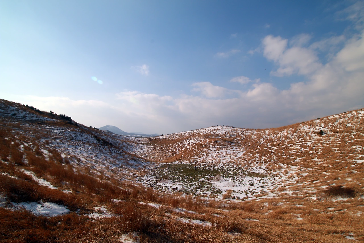 용눈이오름의 아름다움은 유려한 곡선미에 있는 것 같아요. 어는 곳을 바라봐도 정말 여성적인 선의 아름다움을 느낄 수 있죠. 가히 오름의 여왕이라는 소리를 들을만 하죠. 사실 이번 폭설에 내심 기대를 많이 했어요. 하얀드레스를 입은 용눈이의 고운 자태를 볼 수 있겠다는 기대감이 있었거든요. 그런데 보시다시피 눈은 거의 다 녹아버렸더라구요;;;