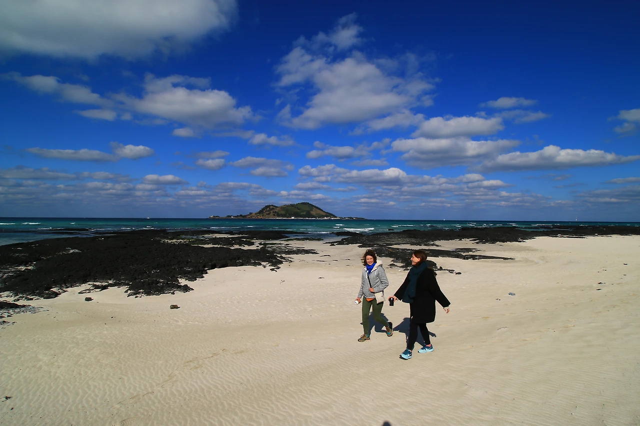 두 번째로 방문할 곳은 금능해변이다. 금능과 협재는 서로 이어져 있다. 사람들은 주로 협재로 가지만 나는 금능을 추천한다. 협재는 늘 사람들로 붐비고 금능은 덜 몰린다. 차를 금능해변 주차장에 세워두고 해안사구를 따라 협재해수욕장으로 걸어갈 수 있다. 돌아올 때는 갯바위 위를 따라 걷거나 모래사장을 밟고 오라. 금능이든 협재든 물이 빠져 있을 때가 더 아름답다.