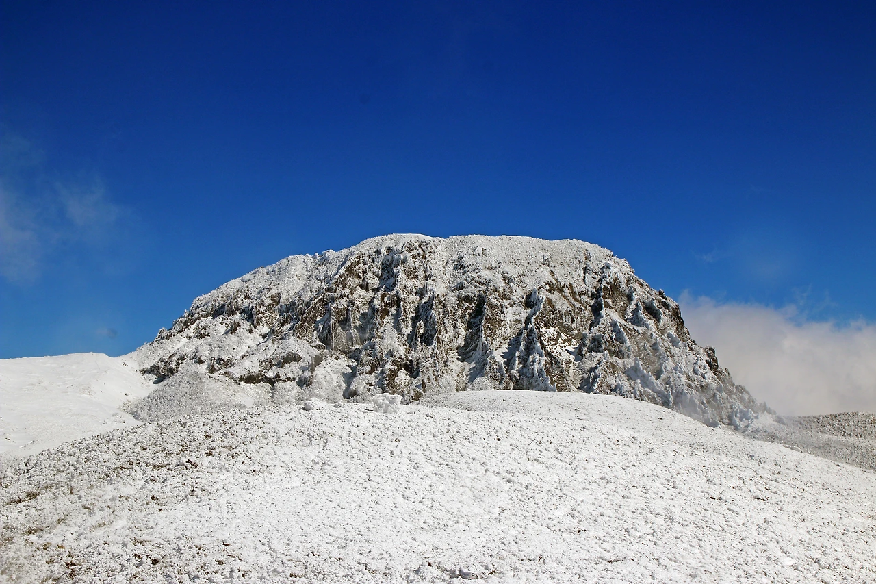 마침내 드러난 백록담의 위용. 성판악으로 올라가서 백록담 분화구를 내려다보는 맛도 일품이지만 저는 사실 겨울산행에서 선작지왓에서 보는 한라산 백록담의 장관을 더 좋아라 합니다. 다가섰을 때 구름에 쌓여 있더라도 낙심하지 말고 한 20~30여분 기다려보세요. 언제 그랬냐 싶게 다시 맑은 자태를 드러내니까요. 올라가는 길에 만나는 윗세오름 전망대는 하산길에 이용하시는 것이 더 좋습니다. 다만 백록담이 확연히 드러나 있다면 먼저 전망대를 이용하고 구름에 가려져 있다면 패스했다가 하산 시 다시 도전해 보라는 것이죠.