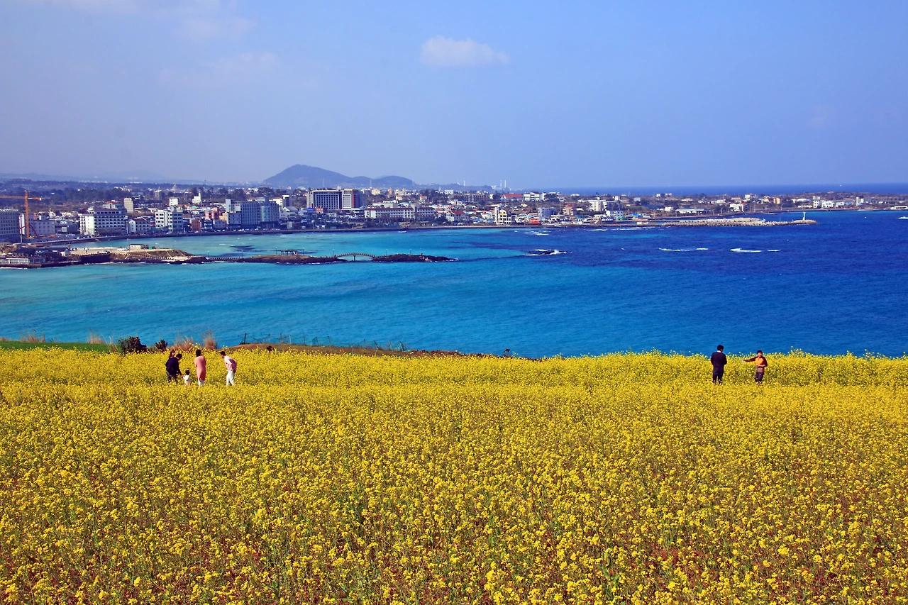 유채꽃은 바다와 만날 때 더 아름답습니다. 그런 장면을 잘 연출해줄 수 있는 장소가 바로 함덕 서우봉이죠. 함덕 서우봉 산책로로 오르다 보면 왼편에 넓게 유채밭이 펼쳐집니다. 하늘빛보다 더 아름다운 바다가 눈에 들어오고 유채 꽃향이 코를 간지럽히죠. 제주 시내에서도 그리 멀지 않은 곳인데 3월 마지막 주까지 유채의 향연을 즐길 수 있을 듯합니다. 입장료요? 그런 것 없습니다.
