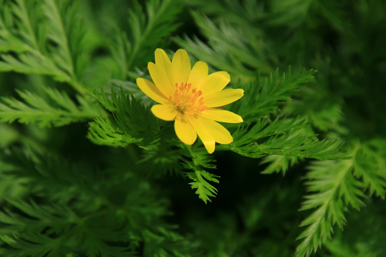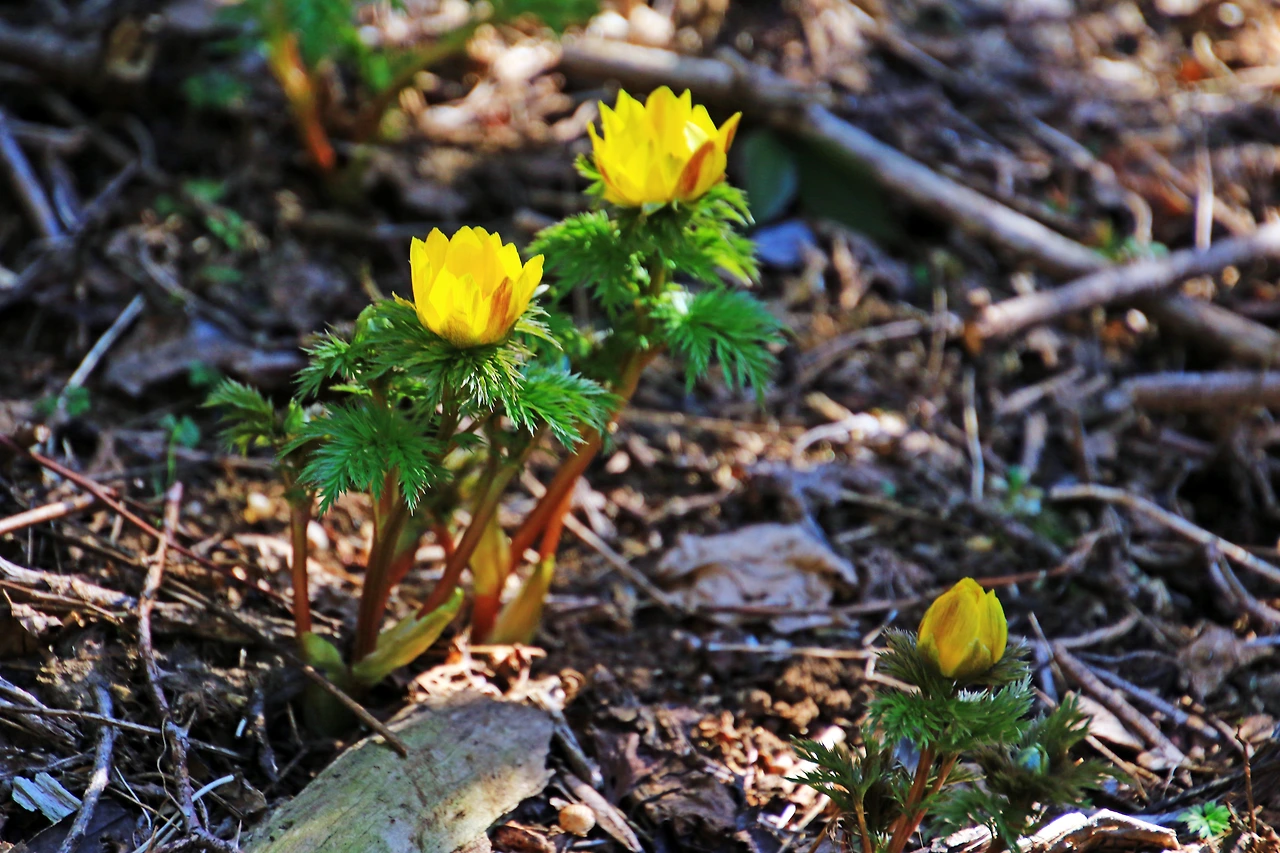 제일 처음 만난 꽃은 복수초입니다. 3월 초에 피기 시작하는 것을 체오름에서 보았는데 거친 오름에서는 아직도 피고 있더군요. 잎이 무성해진 것이 차이가 있다고 할까요?