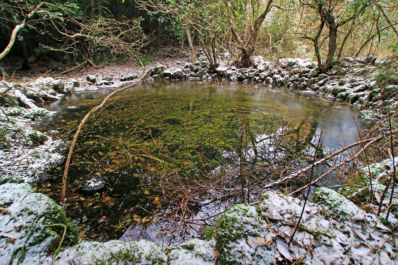 습지, 먼물깍. 먼물은 먹을 수 있는 물을 말하고 깍은 곳이나 터, 공간을 의미합니다. 과거에 선흘리 주민들이 주변에 담장을 둘러 말이나 소에게 물을 먹이던 곳이었으므로 습지를 둘러가며 인공적으로 조성된 돌담이 남아 있으며 이곳까지 자동차가 다닐 수 있는 정도의 길이 나 있으나 지금은 람사르습지로 등록돼 습지보전법에 따라 보호되고 있어 자동차의 통행은 금하고 있어요. 먼물깍 바로 서쪽에는 식수로 사용하기 위해 마련된 작은 물통이 있습니다. 겨울 사진이라 그런데 먼물깍엔 순채라는 수생식물이 가득 자라고 있지요.