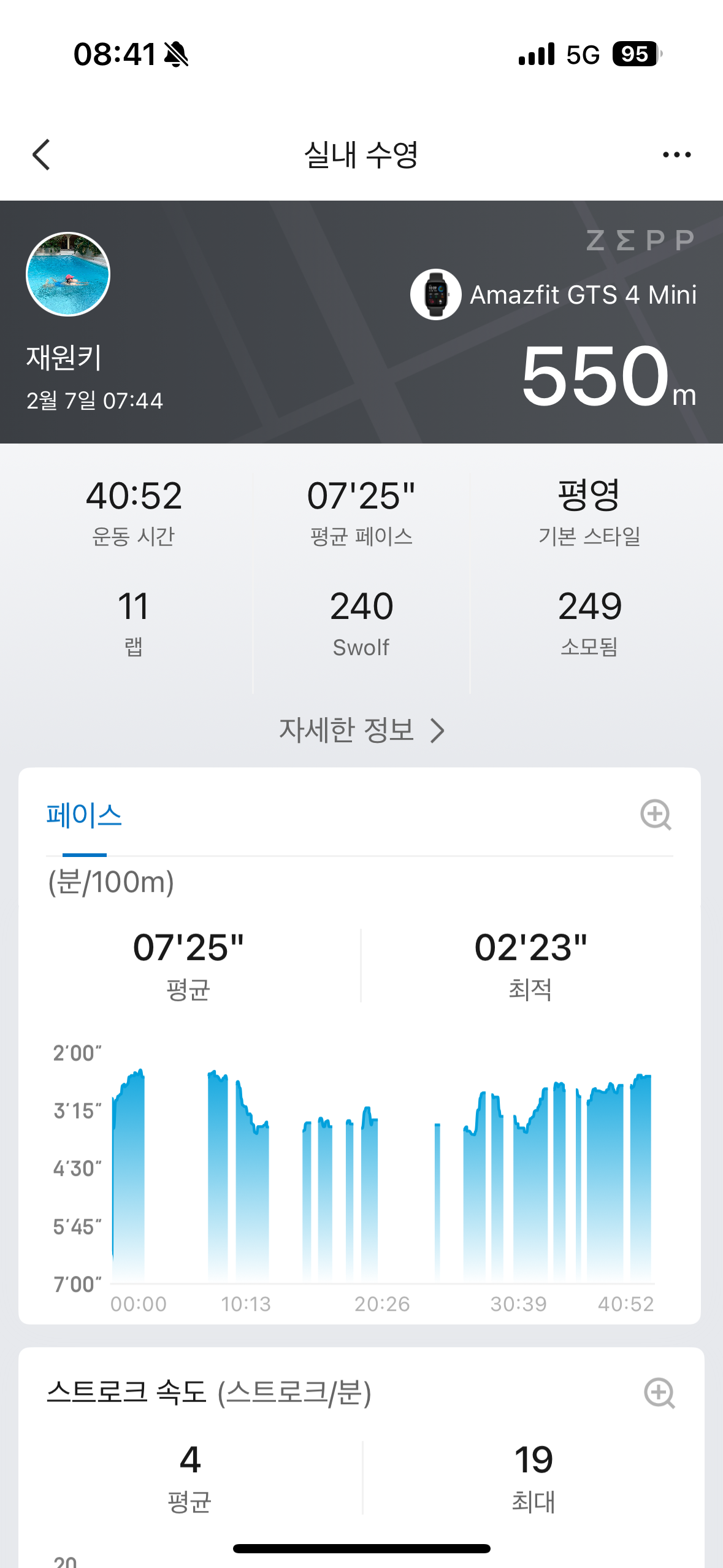 평소보다 수영하는 시간이 짧겠다 싶었는데 40분이 눈 깜짝할 사이에 흘러갔고, 오히려 칼로리 소모시간은 더 늘어났다. 그만큼 주어진 짧은 시간 안에 집중해서 수영을 했다는 증거 같아서 내심 뿌듯했다.