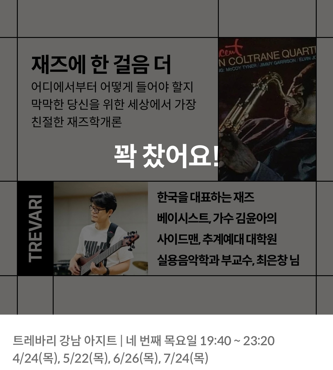 트레바리는 꽤 오래전부터 관심을 두고 있었는데, 책 덕분에 클럽을 하나 이끌게 되었습니다. 사실 대중에게 재즈를 알리는 역할을 막 하고 싶어 한 건 아닙니다. 하나로 뭉뚱그려진 재즈가 아닌, 나의 음악을 듣고자 찾아오는 관객을 원했습니다. 음악인으로서 나는 누구인가, 하는 질문은 놓지 않았습니다. 이상은 높고 성취는 더딘 편이라 눈에 보이는 결과를 내어놓지 못했을 뿐이죠.