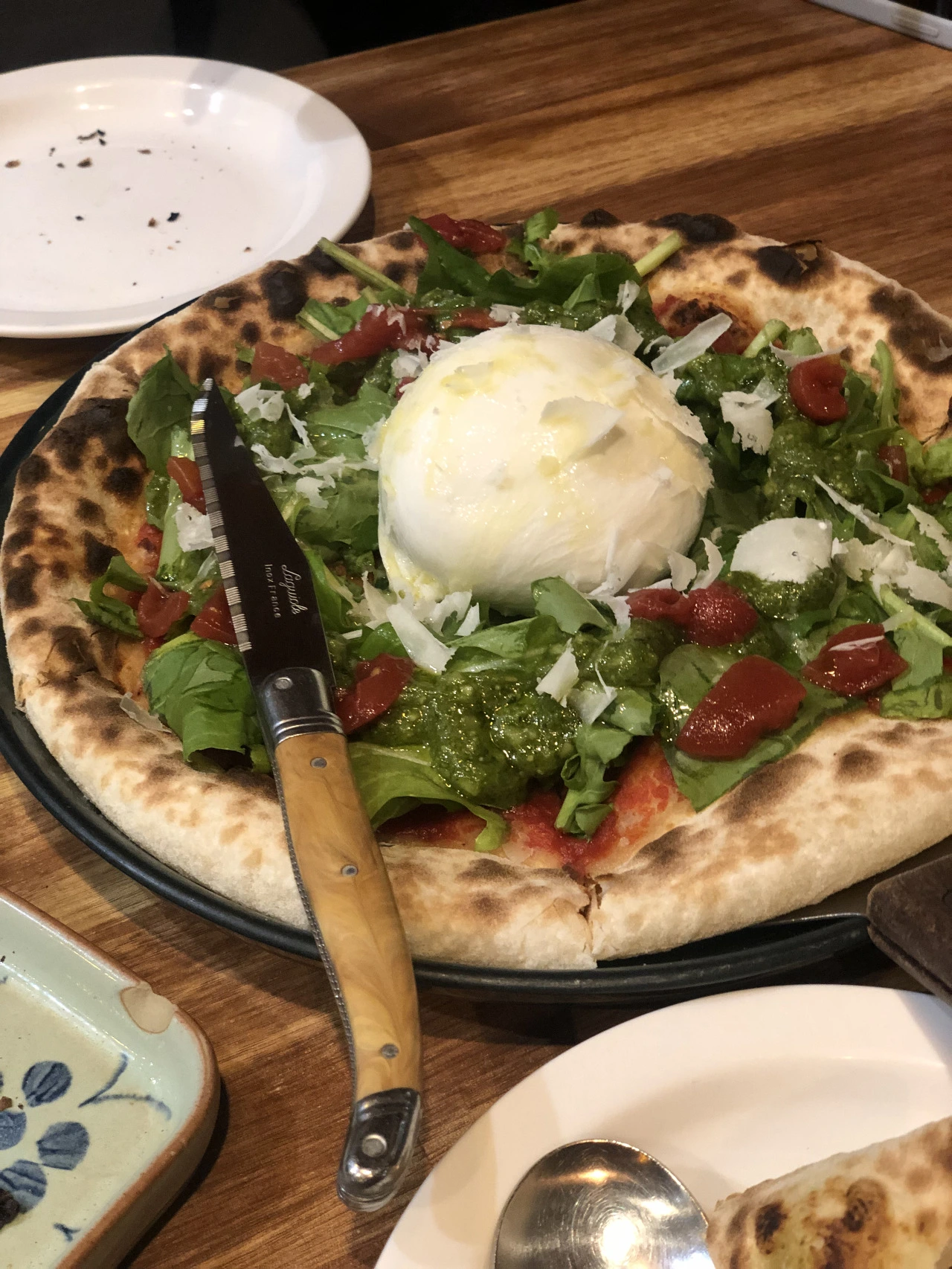 드디어 기다리던 부라타 피자가 나왔다. 역시나 풍성한 초록빛 루꼴라에 바질페스토, 조각낸 새빨간 산마르자노 토마토와 통통한 부라타 치즈 한 뭉텅이. 토핑의 모든 재료들이 신선해 보인다. 가운데 올라가 있는 부라타치즈 부터 칼로 배를 갈라 본다. 순두부처럼 새햐안치즈가 흘러나온다. 한 조각 가득 새하얀 치즈를 올려 내 입으로 가져가 본다. 남유럽 지중해의 신선함이 입안 가득 느껴진다. 부라타치즈의 새콤함과 짭짤함, 루꼴라의 향긋함, 바질페스토의 파릇함, 고소한 올리브유의 풍미. 미쳤다. 엣지 있는 남자의 선택은 역시 옳았다.