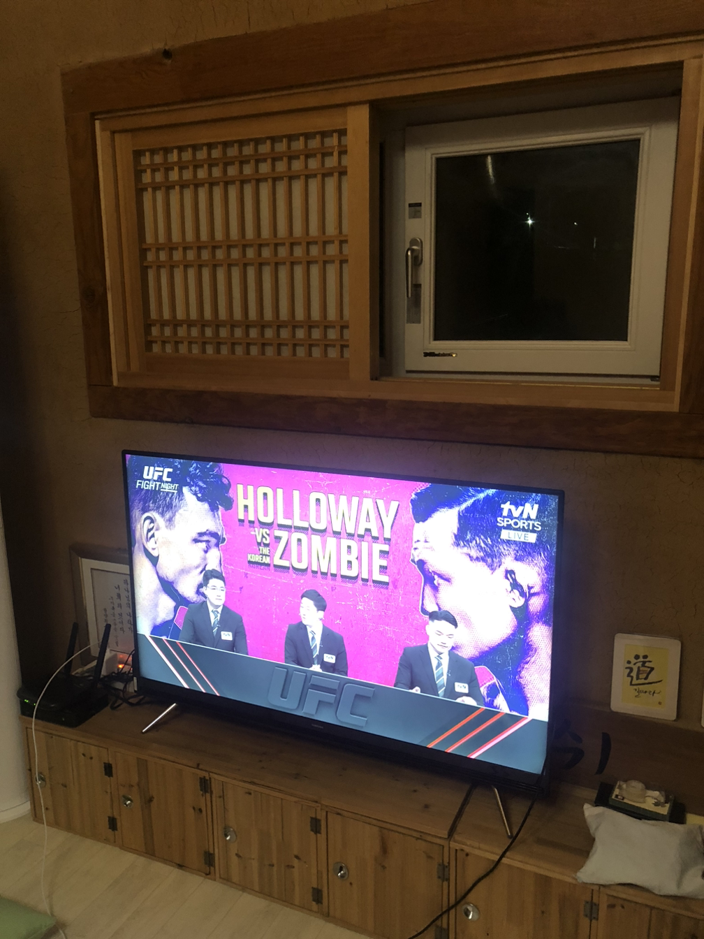 저녁 식사 후 허쓸 시청각 자료 교육: 정찬성 VS 맥스 할로웨이 UFC 경기 단관을 진행 하였습니다.