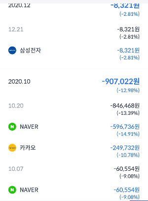 보면 알겠지만 단기 고점이었다. 부모님은 적금을 꾸준히 붓는 걸로 알고 계신데 몰래 깬 돈이라서 너무 불안하고 무서웠다. 그렇게 8월쯤에 구매한 네이버는 -15%, 카카오는 -11%로 떨어졌다. 덜컥 겁이난 나는 큰 손실을 보며 10월 20일 날 두 주식을 매도하였다. 10.20 사태를 계기로 하여 난 두 번 다시 국장은 쳐다도 보지 않겠다 결심을 하였다.