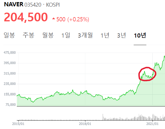 따로 모아둔 적금을 바로 해지하고 받은 300만원~400만원가량 되는 돈 모두를 국내주식인 네이버와 카카오에 6:4 비중으로 투자하게 되었다. 이 두 종목에 투자한 계기는 매우 간단했다! 한국 사람 중에 네이버 안 쓰는 사람 있나? 한국 사람 중에 카카오 안 쓰는 사람 손들어 봐! 이 두 기업은 한국에서 꼭 필요하기도 하고 내 기준으로 국내에서는 IT대장이라 생각했다. 그리고 코로나 시기건 아니건 관계없이 사용한다는 점도 끌렸다. 시작은 좋았다! 투자를 하자마자 5~6%가량 되는 수익이 나왔고 금액으로 따지면 30만원 정도였다. 이런 분위기를 타고 가면 좋겠지만 아쉽게도 바로 조정기간이 왔다. 내가 투자를 시작한 시기는 20년 8월쯤이었고 구매한 금액대는 네이버 34~35만원쯤이었다.