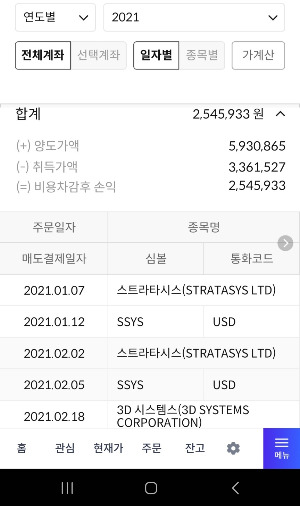 국내 주식 매도 후에 처음으로 샀던 주식들이라 소량으로 구매를 했었고 12월에 매도하여 약간의 수익을 보았다!! 국내에서 상처받았던 마음을 해외 주식이 달래주었다. 시기도 크리스마스라서 산타의 선물인가 싶었다. 위에 보면 종목 중에 3D systems가 보이는데 이 종목이 나에게는 효자 종목이 되었다. 이 종목을 구매하게 된 계기는 유튜브에서 3d 프린터로 집을 짓는 것을 보게 되었기 때문이다. 그래서 3D 프린터 대장주를 네이버에 검색하여 찾아보니 3D systems여서 구매하게 되었다.