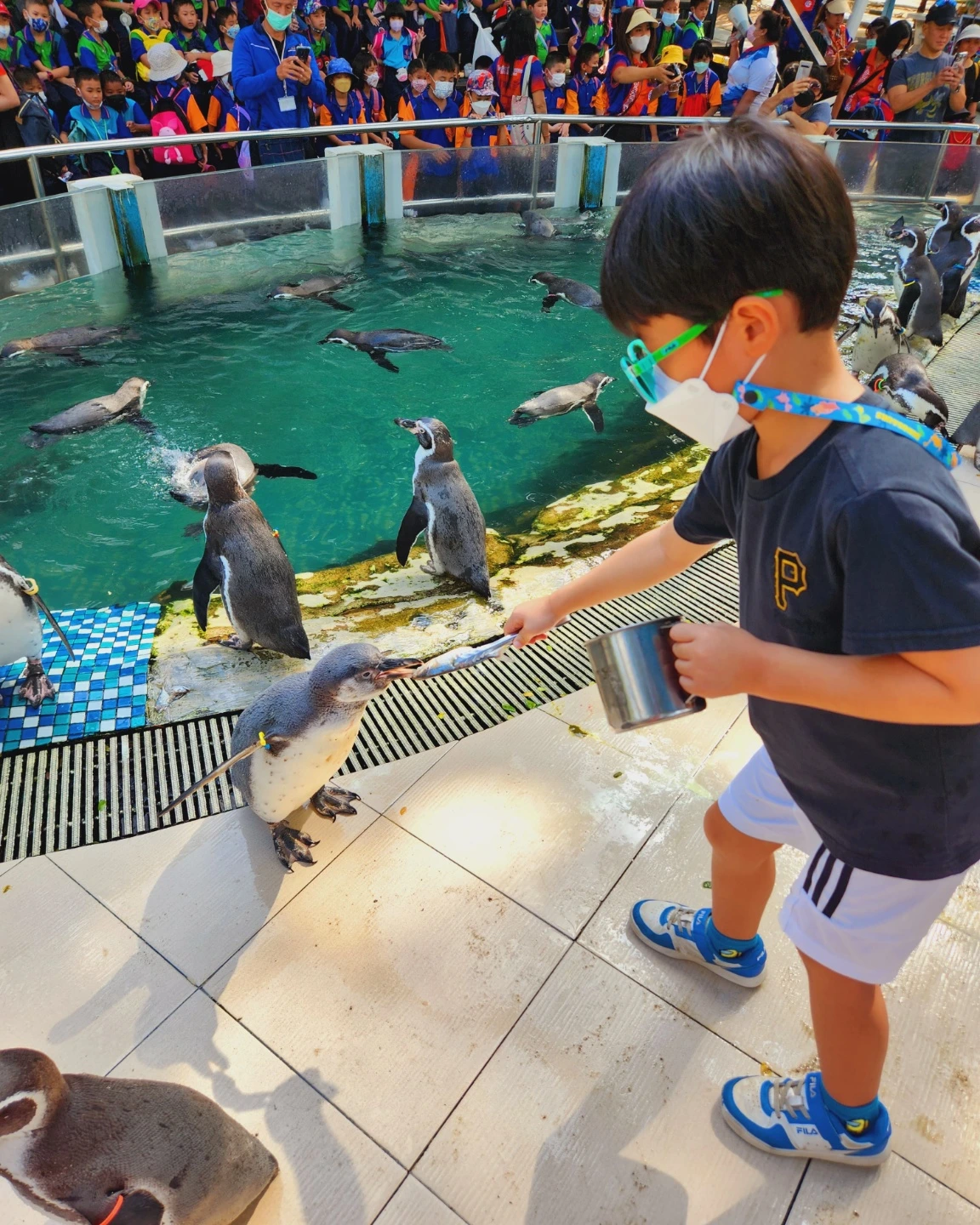 펭귄 녀석들을 만났다. 퍼레이드를 마친 펭귄들은 허기져 보였고 아들은 펭귄에게 물고기 주기 체험을 하였다. 물고기 네 마리가 든 스텐 통을 들고 녀석들에게 다가가 입에 물고기 한 마리씩을 넣어주었다. 비교적 긴 부리로 물고기 한 마리를 통째로 잘도 먹었다.