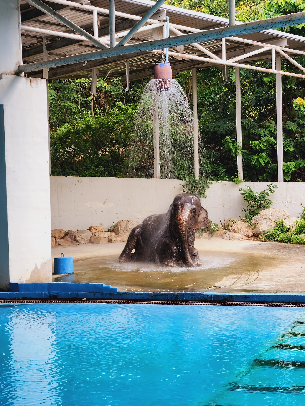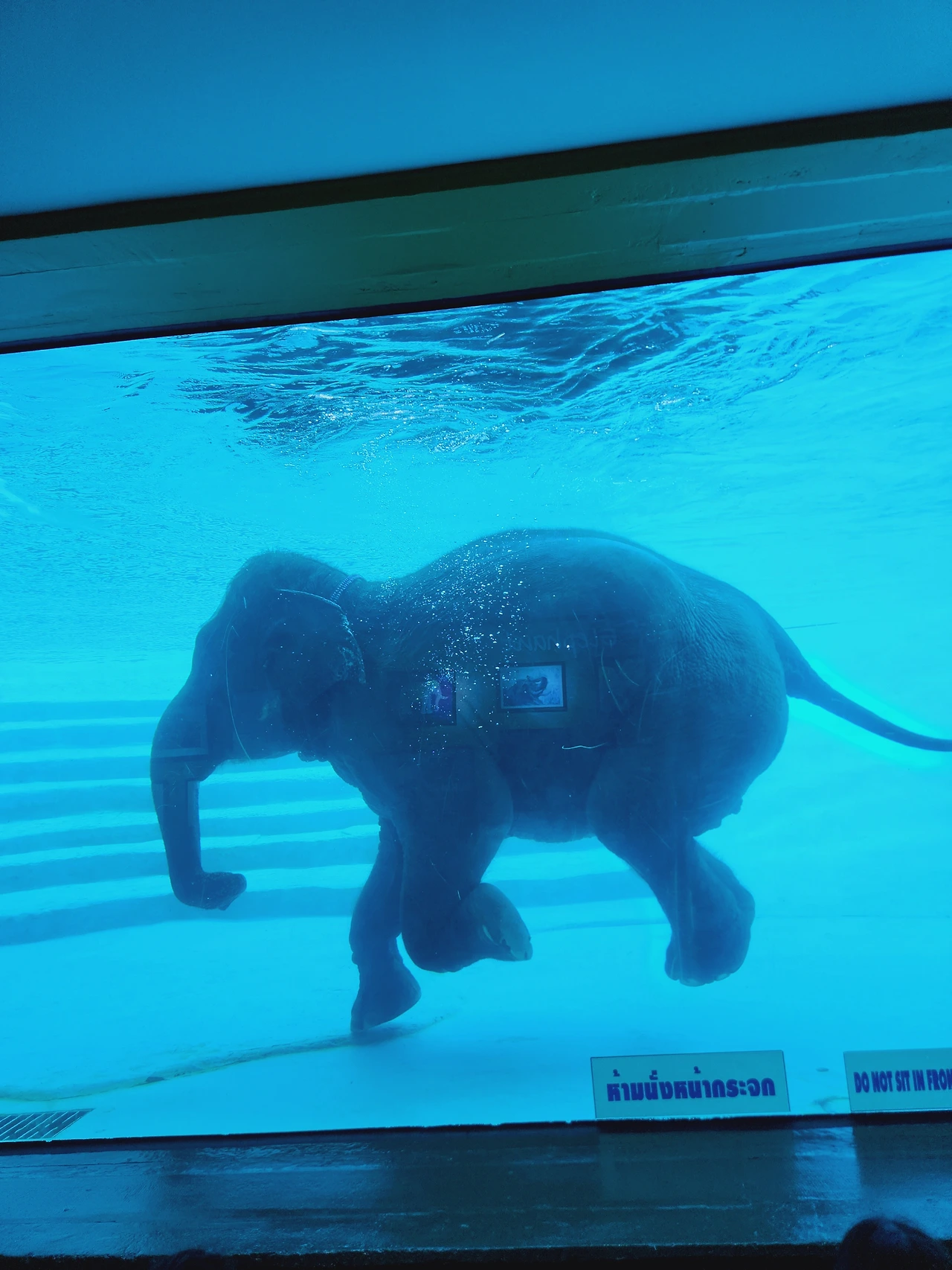 뒤이어 코끼리 쇼를 보았다. 코끼리가 무대 위로 나타나 별안간 샤워호스 밑에서 샤워를 한다. 시원하게 내리꽂는 물줄기로 육중한 몸 구석구석 샤워를 마치더니 응가를 한 포대 싸는 퍼포먼스를 보여주었다. 축구공만 한 코끼리 응가에 아들은 제법 놀란 눈치였다. 목욕재계를 다 마친 코끼리는 이내 그의 몸이 다 잠길만한 목욕탕으로 들어와 수중 퍼포먼스를 보였다. 돌고래쇼 같은 대단한 묘기를 부릴 거라 기대했는데 그저 수중 코끼리 발레를 보는듯한 몸짓에 만족해야 했다. 그래도 물속에 완전히 잠긴 코끼리의 모습은 신기했다.