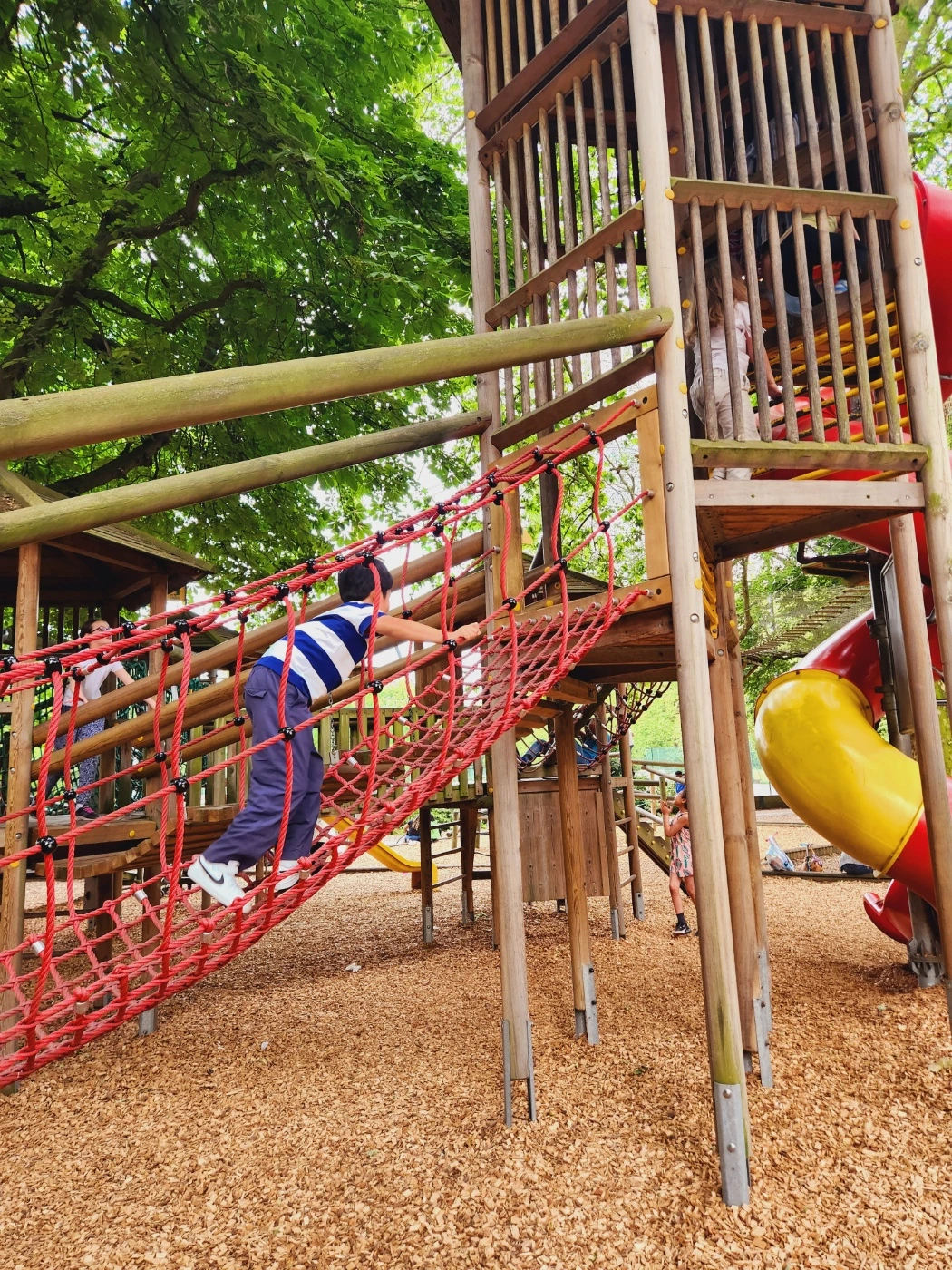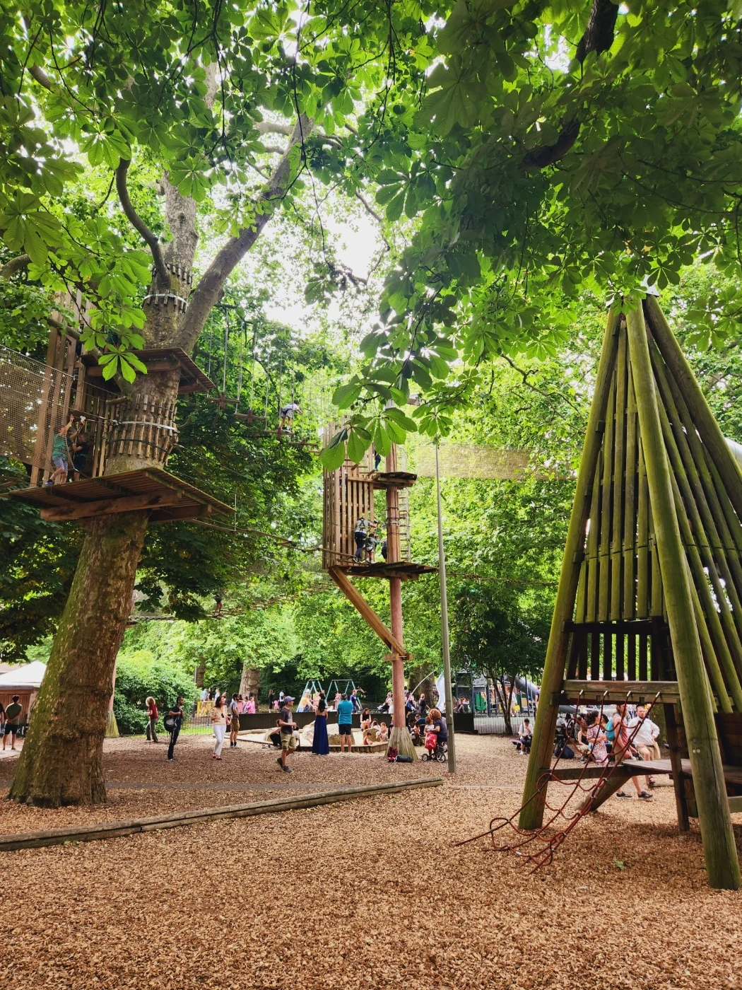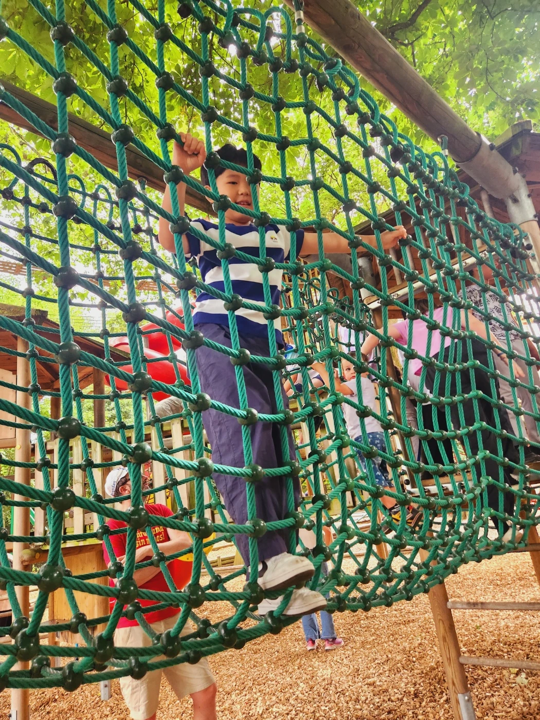 놀이터 상공에는 높고 굵직한 나무들 사이로 사람들이 타잔처럼 짚라인을 타고 이동하고 오르내리며 난리가 한바탕이었다. 온라인으로 미리 예약해야만 체험이 가능했는데 인기가 많아서 당일은 어림도 없다고. 주로 아이가 아닌 어른들이 도전했는데 날아다니는 아빠들도 있는 반면 고전하여 길막하는 아빠들도 있어 같이 손에 땀을 쥐었다.