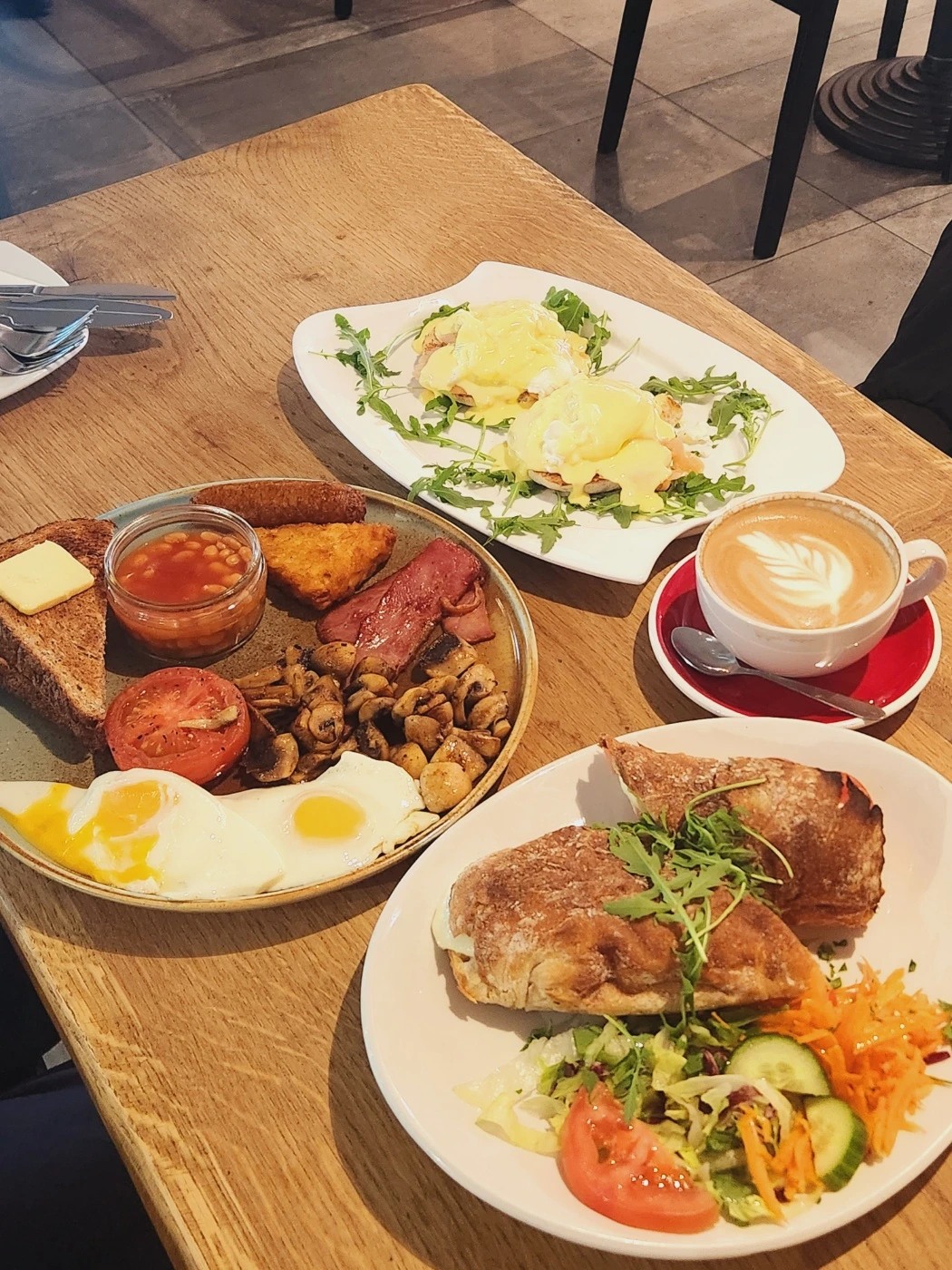 영국에서 귀하다는 청량하고 맑디 맑은 날씨를 누리며 동네를 걸어내려가, 브런치집에 당도. 에그베네딕트와 치아바타 샌드위치, 브랙처스트 세트 까지 인당 하나씩 시켜 야무지게 쉐어하며 먹었다. 그땐 몰랐지만 여행기간동안 아침식사 한 곳 중에 가장 맛있었던 집이었다. 겉은 바삭하고 속은 촉촉한 치아바타와 녹진한 카페라떼의 맛이 지금 글을 쓰는 이순간 무지 생각난다.