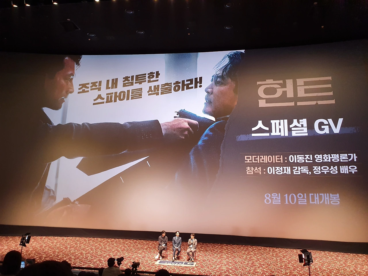 영화는 대한민국 80년대의 사회 이야기를 담고 있다. 굳이 80년대의 한국이 어땠는지 알고 있지 않아도, 재미있게 볼 수 있지만 알고 본다면 재미는 배가 될 것 같다. 필자는 따로 찾아보고 가지는 않았는데, 근현대사 사건에 대해 원래 관심이 많았던 편이라 영화를 보며 '이 사건이 이렇게 등장하는구나'하고 보는 묘미가 있었다. 스토리가 밀도가 높은 편이라서 집중해서 봐야 하지만, 처음부터 계속 보다 보니 스토리에 그냥 매료되었다. 이정재 감독이 각본을 다루신 건 거의 처음일 텐데, 이렇게까지 깔끔하면서 깊게 이야기를 풀어낼 수 있었는지 정말 궁금하다. GV 때 말씀하신 것을 들어보니 '남산'이라는 제목을 가진 초고에서 감독님이 정말 많은 것을 수정해서 '헌트'라는 각본이 나왔고, 그 수정하는 과정에서 본인이 원하는 메시지와 주제를 담기 위해 정말 많은 노력을 하신 것 같았다. 영화에서 그 노력의 결과가 잘 드러났고, 아무리 생각해도 감독님께 찬사를 보낼 수밖에 없는 것 같다.