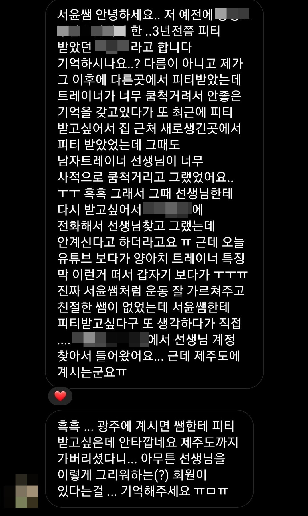단 한번(현재 여자친구)을 제외하고, 회원님들과 사적으로 만나지 않는다고 했다.