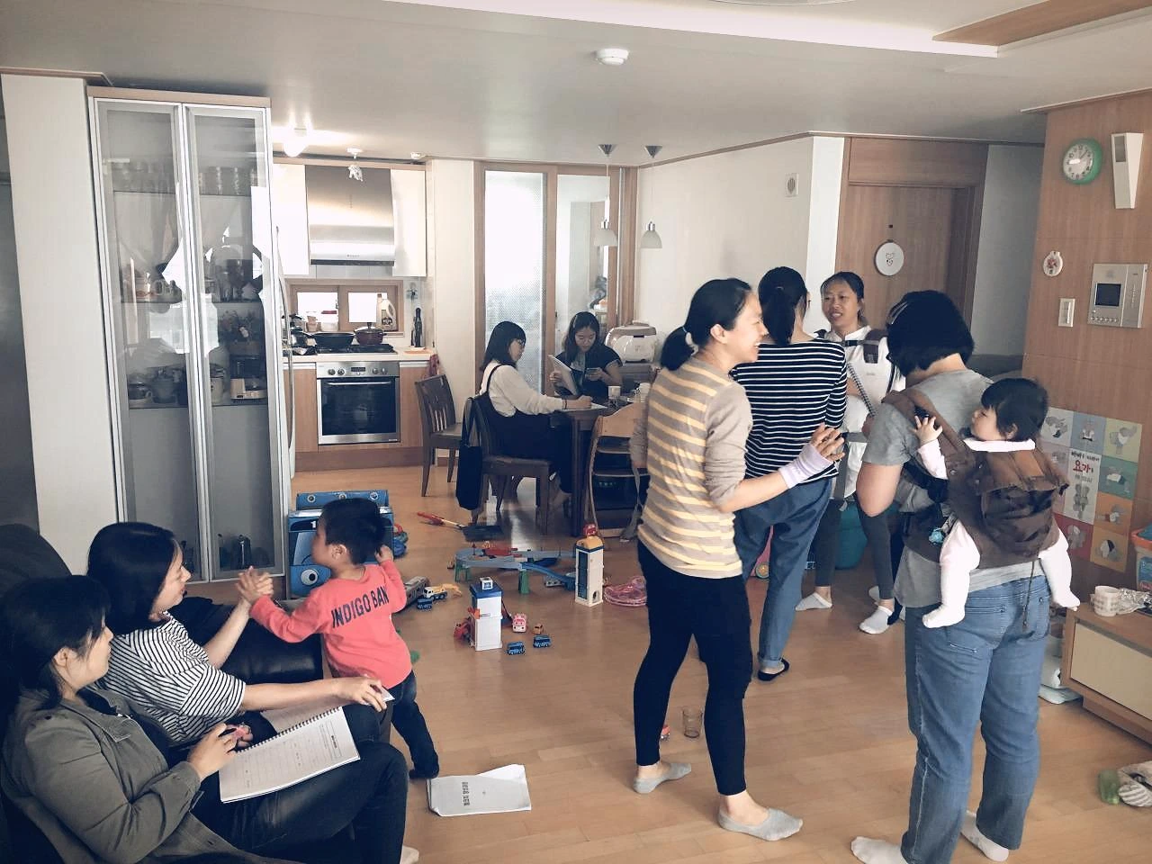 그렇게 도착한 첫 날. 그 날의 당황스러움을 잊을 수가 없다. 9명의 엄마들과 대략 6명의 아이들이 거실을 가득 메우고 강사를 기다리고 있었다. 한복판에 장난감과 아이들이 뒤섞여 있고, 한 구석에서는 기차가 레일을 따라 돌고 또 한 구석에는 백일 된 아가가 천장을 보고 누워있었다. 강의가 시작되었지만 아이들은 자기의 할 일을 계속 했다. 모유가 필요한 아기는 그 자리에서 모유를 먹고, 놀다가 울음이 터진 아이는 강사의 육성을 다 덮고 앙앙 울었다. 그 와중에도 엄마들은 눈빛이 빛났고 들을 것을 다 알아 들었다.