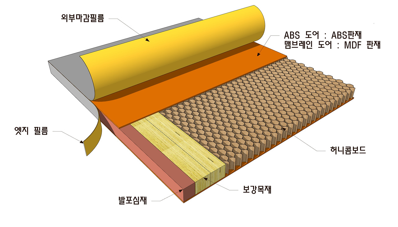 문짝의 구성은 보강 목재로 틀이 만들어지고 가운데 빈 공간에 벌집구조를 종이로 만든 허니콤 보드가 채워지며 발포 심재로 태두리를 감싸고 문짝의 앞뒤로 판재가 붙어 문짝을 이루게 됩니다. 이때 문짝의 겉에 부착되는 판재의 소재에 따라 ABS 도어와 멤브레인 도어로 나누어집니다.