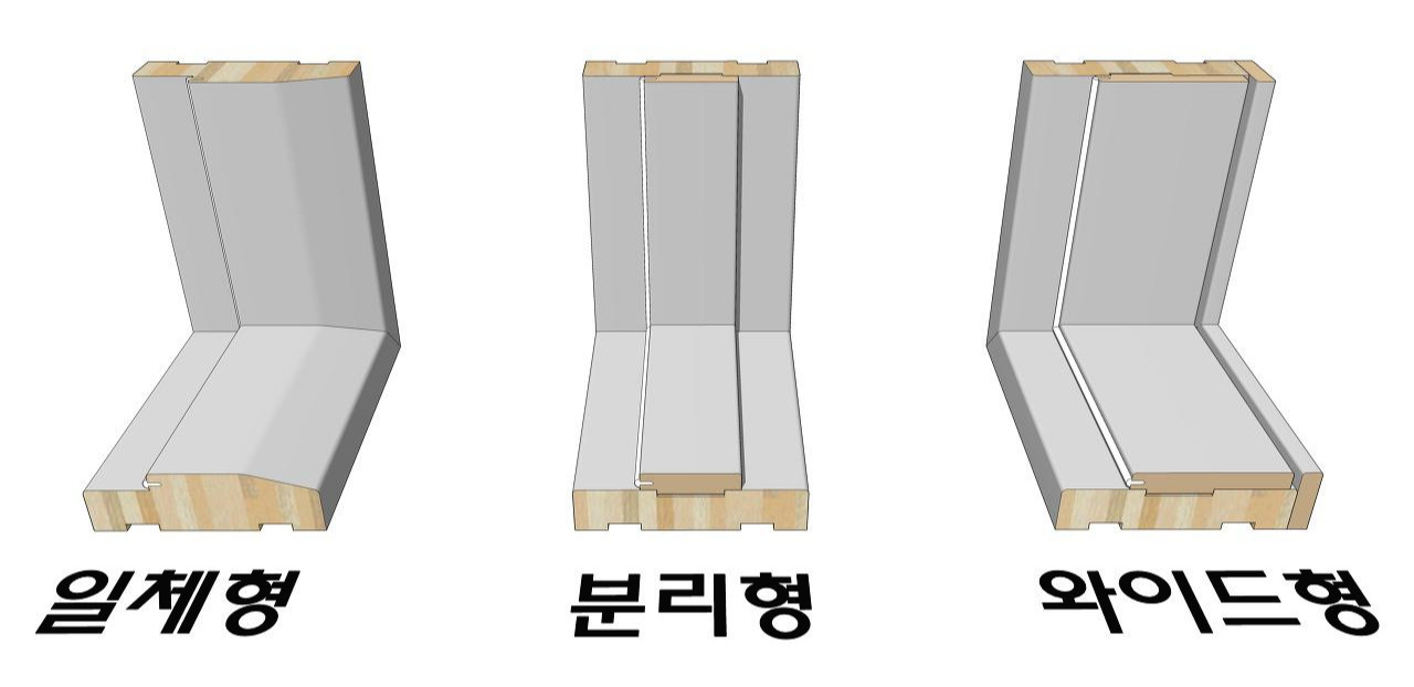 와이드형 문선몰딩목재 문틀의 종류는 문틀과 스토퍼가 하나로 되어 있는 일체형과 문틀과 스토퍼가 분리되어 있는 분리형이 있습니다. 스토퍼 분리형 문틀은 일반형과 와이드형이 있는데 와이드형을 사용할 경우 문선몰딩의 디자인이 달라지게 됩니다.