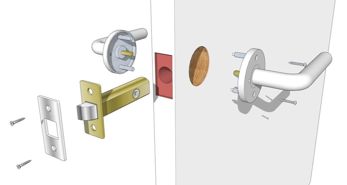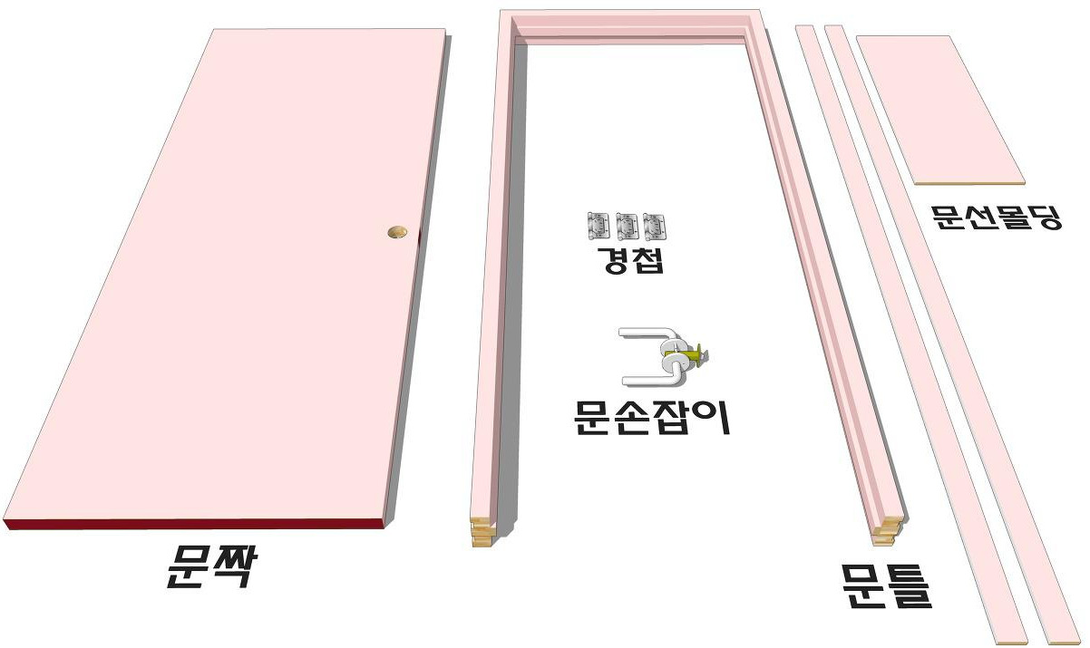 방문의 기본적인 구성은 문짝, 문틀, 문선몰딩, 문손잡이, 경첩으로 이루어져 있으며 그 외 필수는 아니지만 편리함과 기능이 좋아지는 방문용 도어 클러저, 도어스토퍼, 손끼임 방지캡 등이 있습니다.