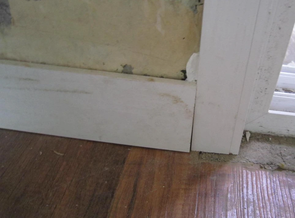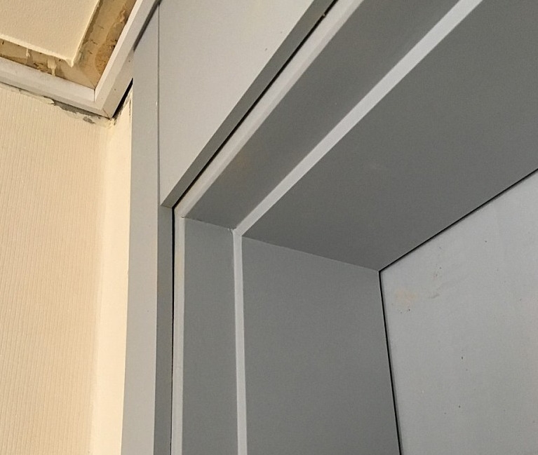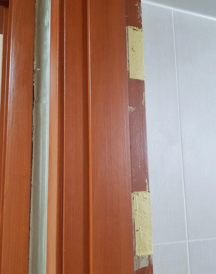 문틀의 비닐을 제거하지 않고 그위에 문선몰딩을 시공했습니다.방문틀이 제작되어 현장에 도착하면 최종 마감 전까지 파손을 방지하기 위해 문짝과 문틀 표면에 비닐이 제거하지 않습니다. 문짝의 비닐은 상관없지만 문틀의 비닐이 문제가 될 수 있습니다. 문틀을 시공하고 문선몰딩을 문틀에 부착할 때 문선몰딩이 부착되는 면의 비닐을 먼저 제거하고 문선몰딩을 부착해야 합니다. 보호비닐 위로 문선몰딩을 부착하게 되면 나중에 비닐 제거를 위해 커터칼을 사용하게 되는데 이때 힘 조절을 잘못하면 문틀의 마감 필름까지 절단하게 되며 잘 절단하더라도 문선몰딩과 문틀사이에 남아있게 되고 비닐의 인쇄되어있는 글씨가 얼룩덜룩하게 보일 수 있습니다. 이게 당연히 해야 하는 작업이지만 생각보다 많은 작업자들이 대수롭지 않게 생각합니다.