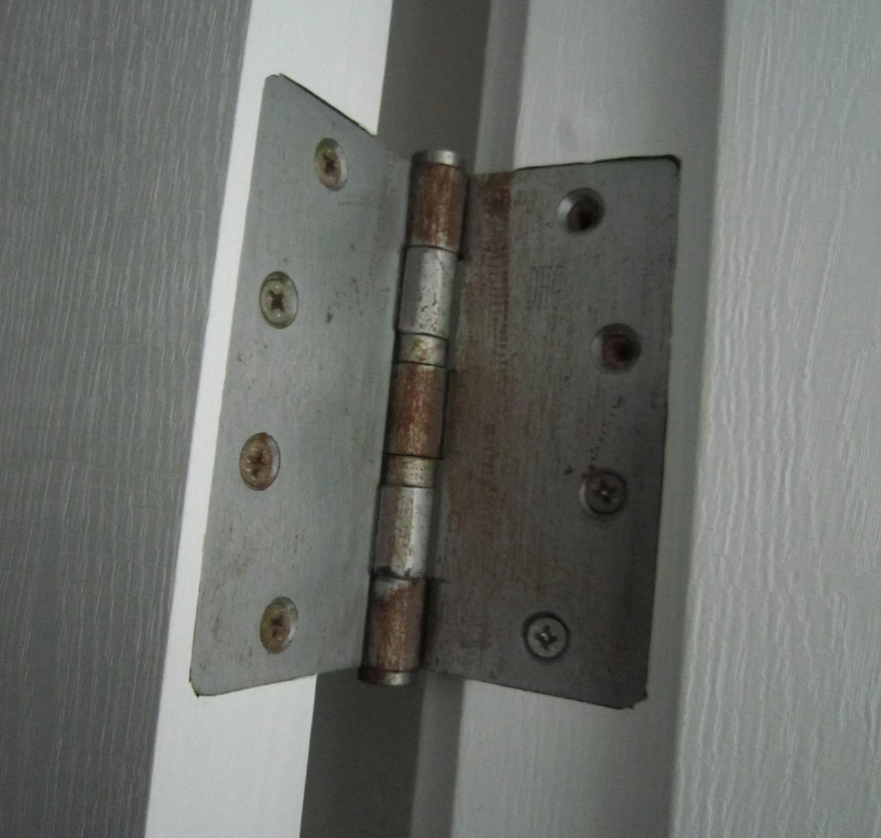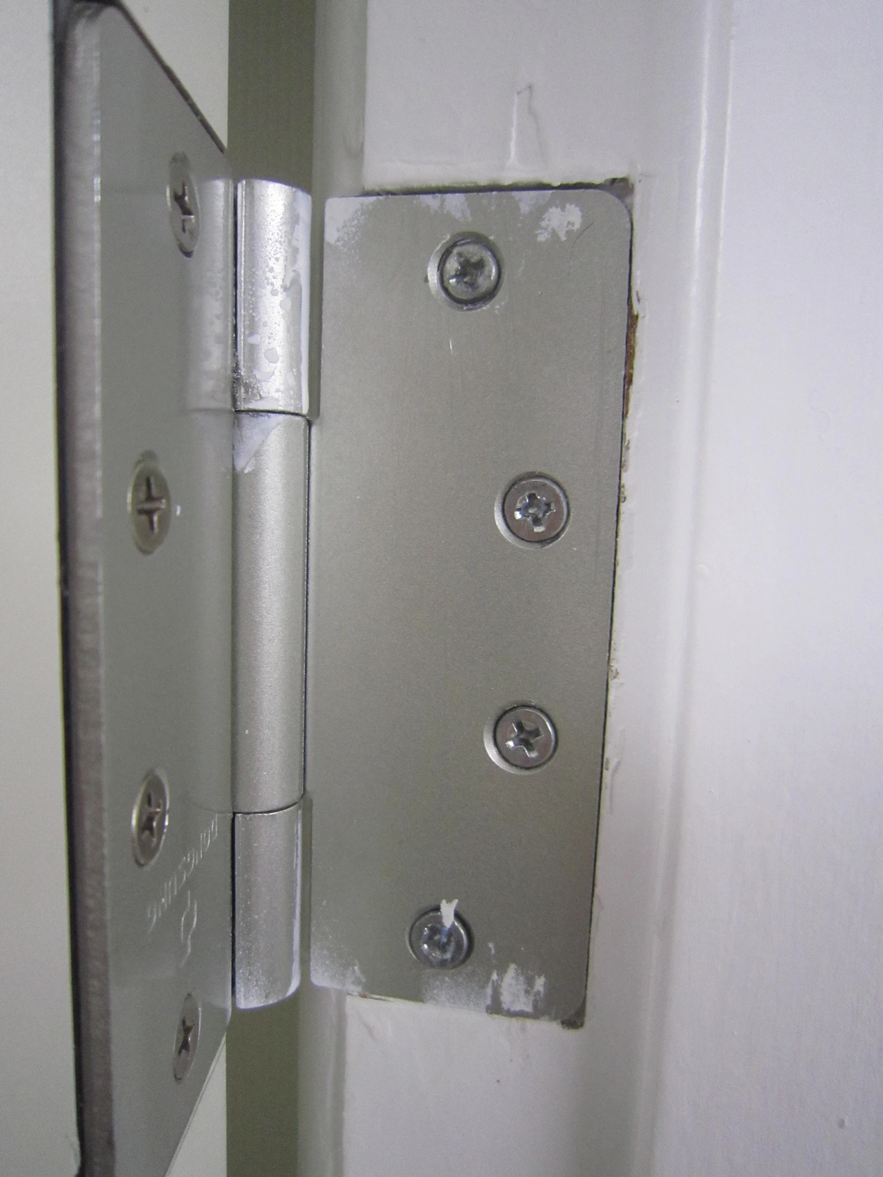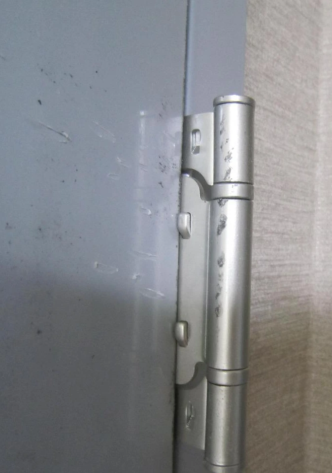 문짝이나 문틀에 문제가 있지만 그냥 설치한 후 경첩을 망치로 때려 억지로 문을 맞춰 작업자가 녹이 슨 망치로 경첩을 때려 경첩이 휘고 상처가 나고 문짝에도 망치 자국을 남겼습니다.