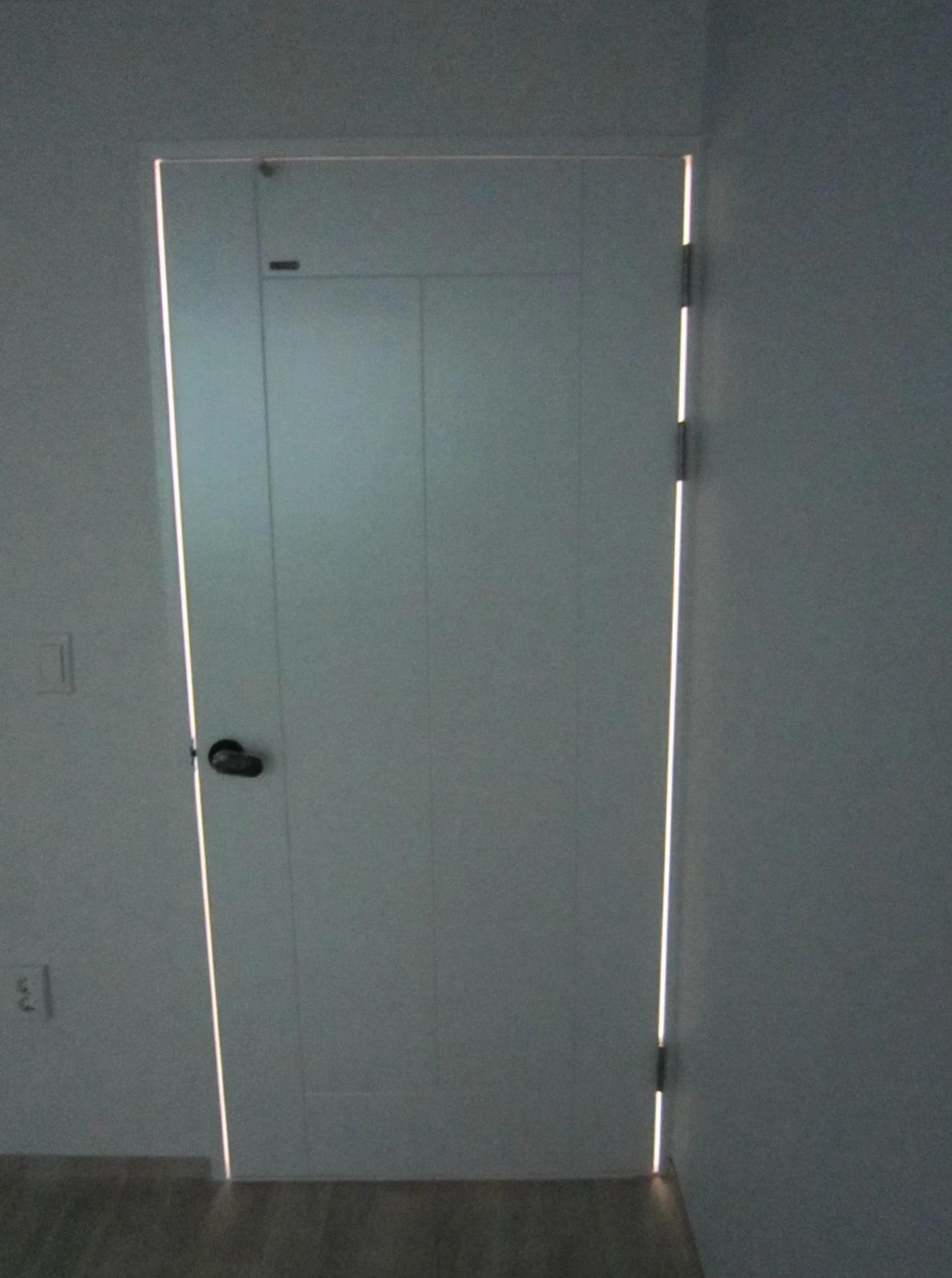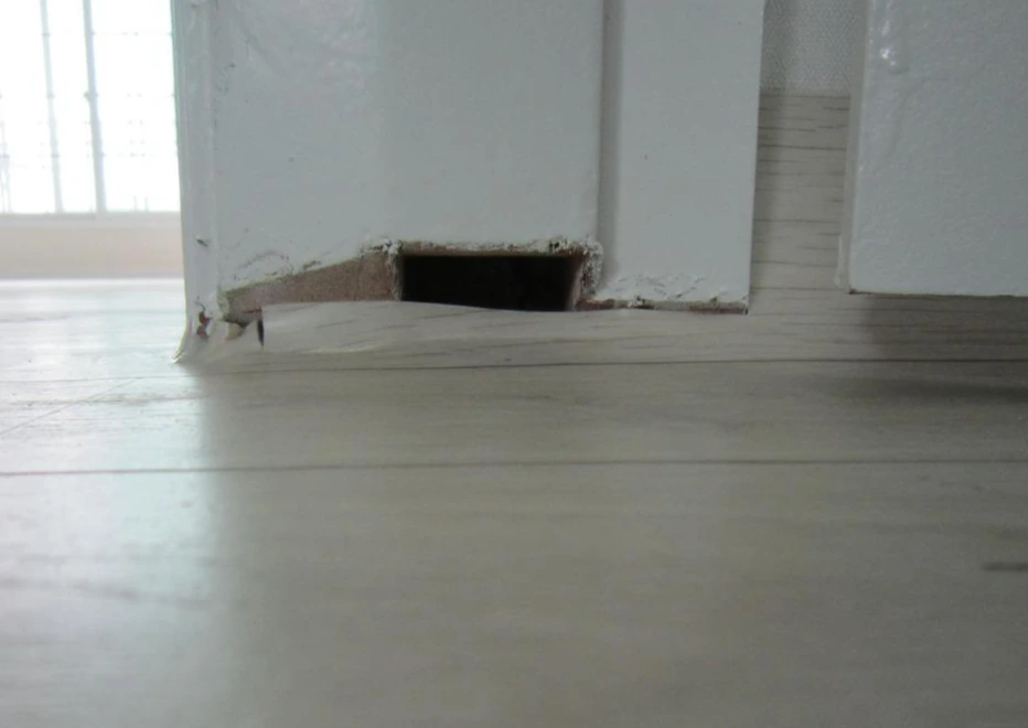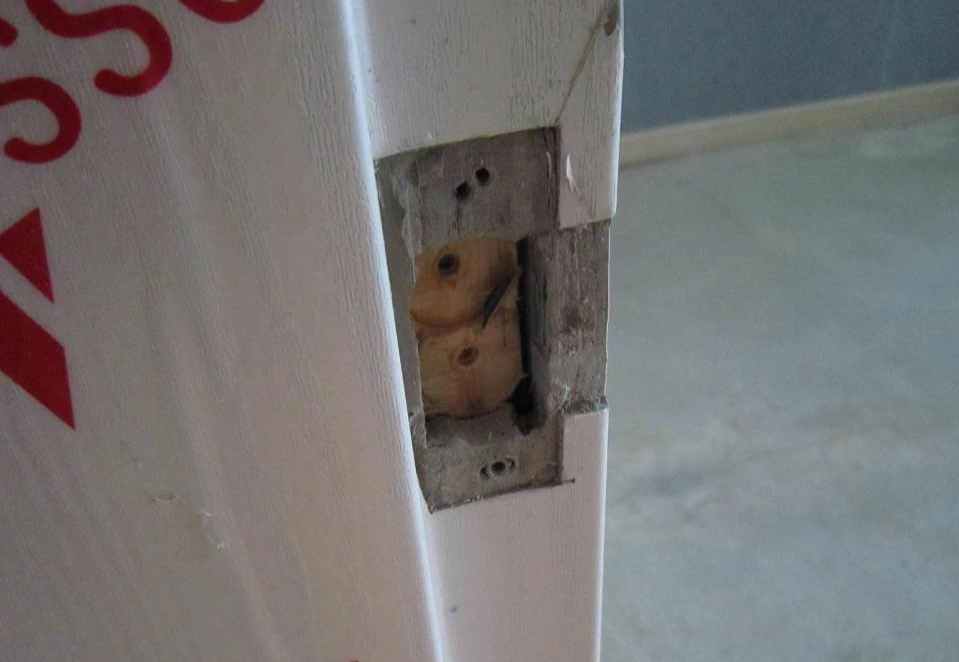 반대로 방문의 크기가 작게 제작되어 왔을 때 반품하지 않고 경첩을 휘어 억지로 맞추거나 래치가 걸리는 캐치라는 부속을 억지로 휘거나 문틀보다 높게 만들어 마치 문이 잘 닫히는 것처럼 시공합니다.