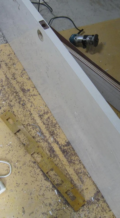 문손잡이가 설치되는 문틀과 문짝 부분에 홈을 파야하는 작업이 있는데 이 부분은 가이드를 사용하여 트리머라는 공구로 정확하게 작업을 해야 합니다. 예전에는 끌로 작업을 했지만 홈을 파는 부분이 나무가 아닌 PVC 소재이기 때문에 기계로 깨끗하게 마무리해야 합니다.