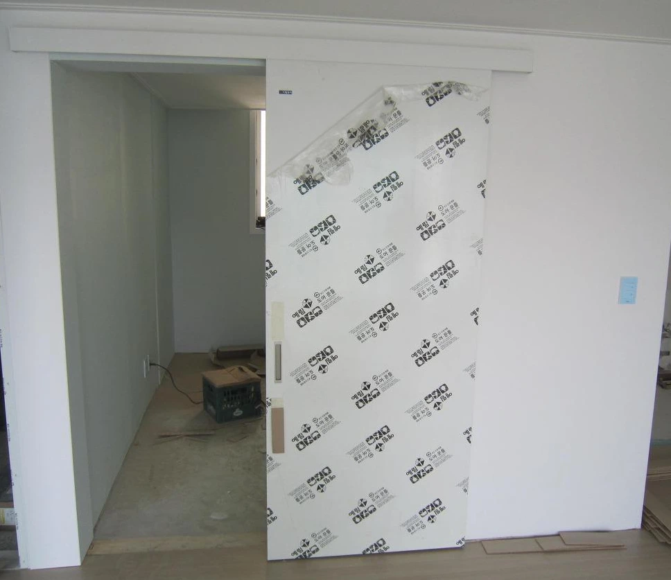 방문은 열리는 방향으로 공간을 차지하기 때문에 문으로 인한 공간 손실을 줄일 수 있는 방법으로 헹거 도어를 설치하게 됩니다. 헹거 도어는 상부에 고정되어있는 레일에 문짝 상부에 부착되어 있는 롤러가 이동하고 하부에 부속이 문짝을 이탈하지 않게 합니다.