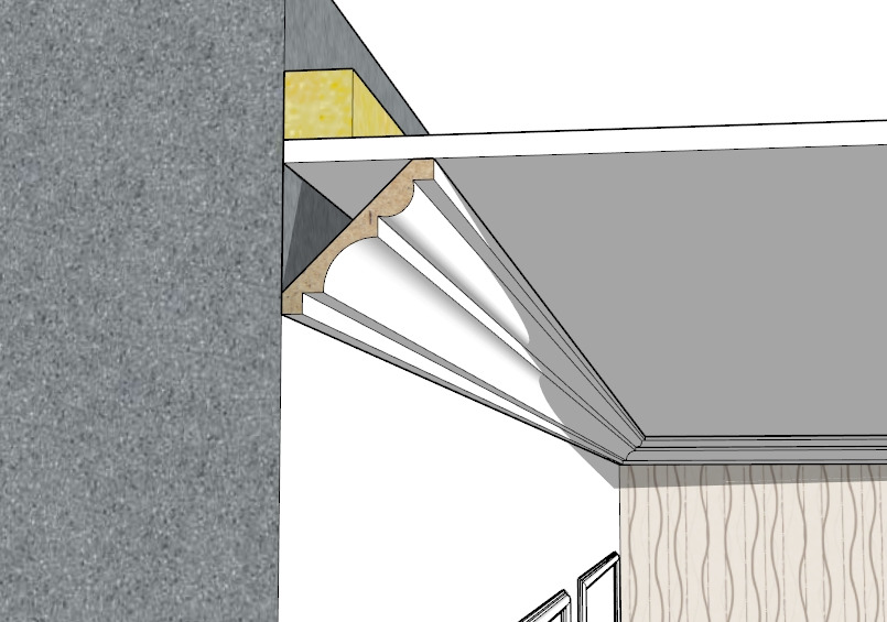 비스듬하게 기울어진 상태로 시공되어 그 모양의 단면이 왕관처럼 보여 크라운 몰딩이라고 하며 몰딩 자체의 단면 모양 때문에 갈매기 몰딩이라고도 부릅니다. 대부분 천장 몰딩으로 사용되며 유행이 지난 몰딩이지만 시공 부분의 상태에 따라 선택해야 하는 경우가 있어 요즘도 많이 사용되고 있습니다.