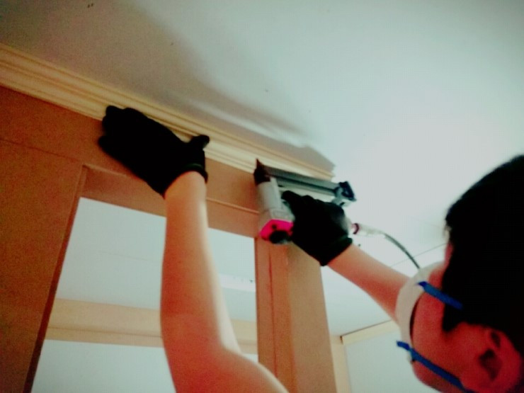 몰딩을 부착하는 방법은 에어타카를 사용하여 못으로 고정하는 방법, 실리콘과 글루건을 이용하여 부착하는 방법이 있습니다. 목재나 석고보드 위에 부착할 경우 타카를 사용하고 콘크리트나 석재처럼 못이 안 들어가는 경우 실리콘을 사용하게 됩니다.