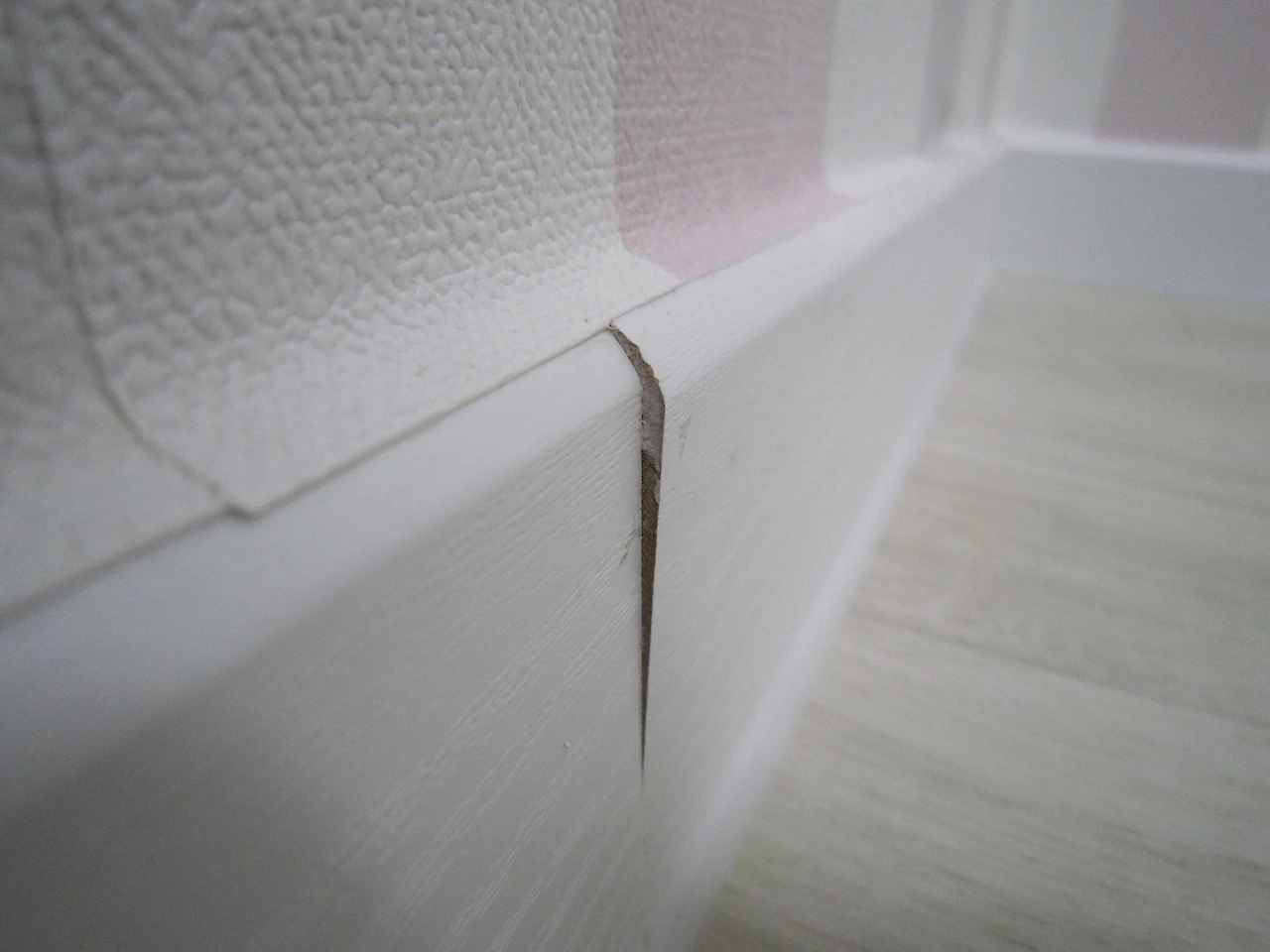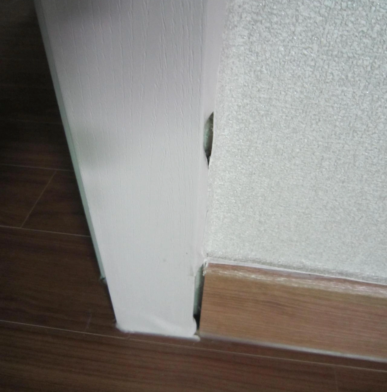 mdf로 만들어진 래핑 몰딩이나 현장에서 mdf로 만들어 시공하는 경우 자재를 외부에 보관되었다가 실내에 시공되는 경우가 대부분이고 시공된 후 각종 마감작업에 의해 습도나 온도 변화가 발생되면서 몰딩의 수축이 발생됩니다. 그렇기 때문에 래핑 몰딩의 경우 연결부 작업 시 필름과 절단면을 연결하면 안 되고 같은 절단면에 목공 본드를 사용하여 작업해야 합니다.
