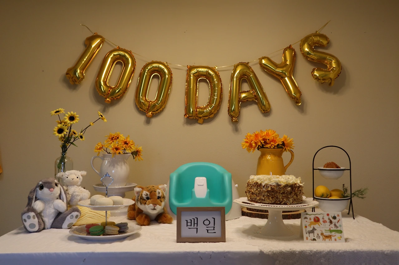 촬영 2주 전, 빌려온 물품들을 차례로 꺼내며 시험 삼아 백일상을 꾸며 보았다. 나는 하얀색과 노란색을 주제로 하여, 너무 복잡하지 않게, 아기 중심으로 대칭이 되는 그림을 원했다. '100 days'라고 쓰인 풍선 배너, 연노랑색 털실공도 구입했다. 원래는 전통 실타래를 올려야 하는데, 미국에서 구하기 쉬운 털실공으로 대체했다. 어차피 같은 실 종류이니, 장수의 상징 맞다. "우리 아기 오래오래 건강하게 살아라" 하는 염원은 똑같이 전해질 것이다.