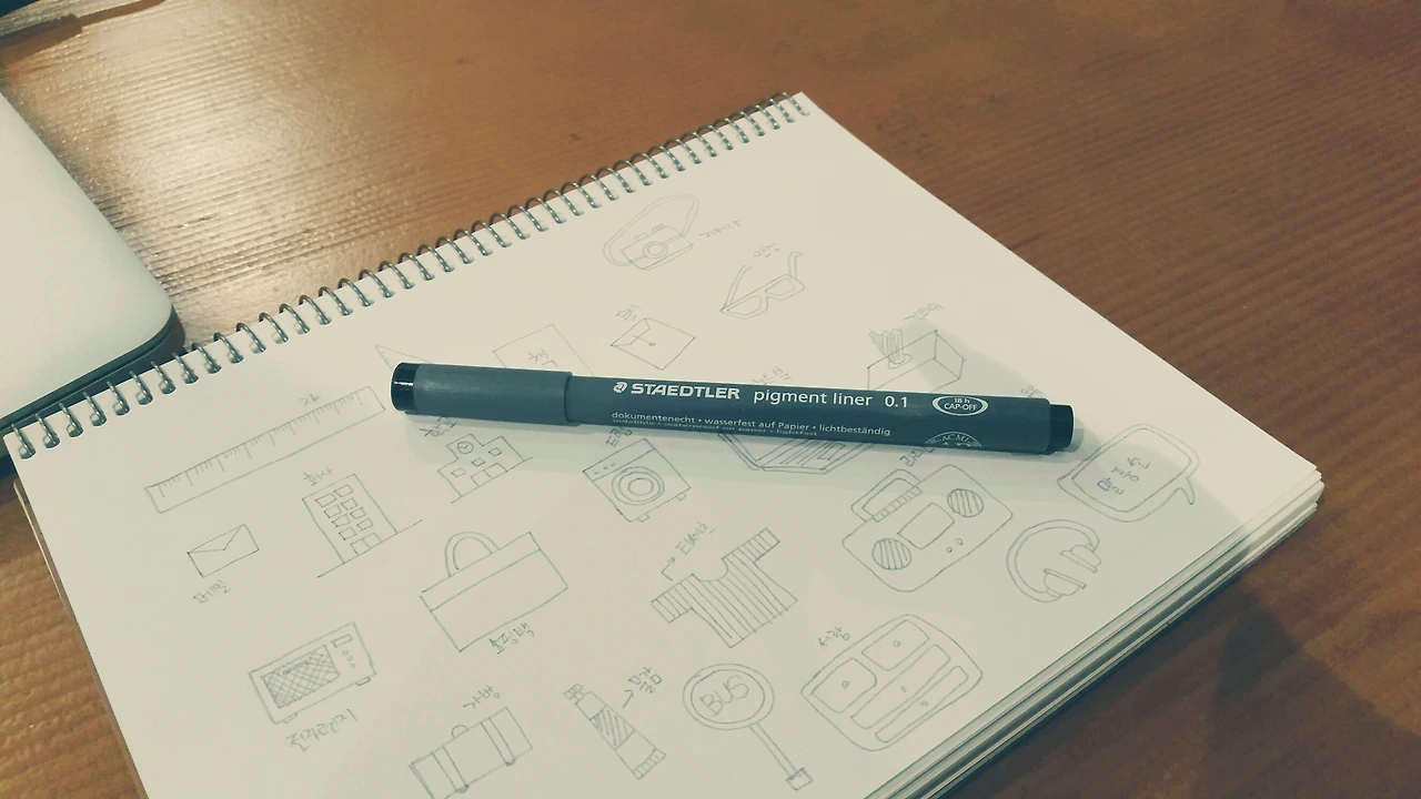 연필, 지우개, 스케치 북이 놓여 있습니다.