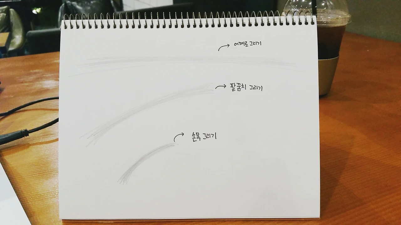 팔꿈치를 사용하여 그리는 경우 손목으로 그릴 때 보다 조금 더 길고 넒은범위의 선을 표현할 수 있습니다.