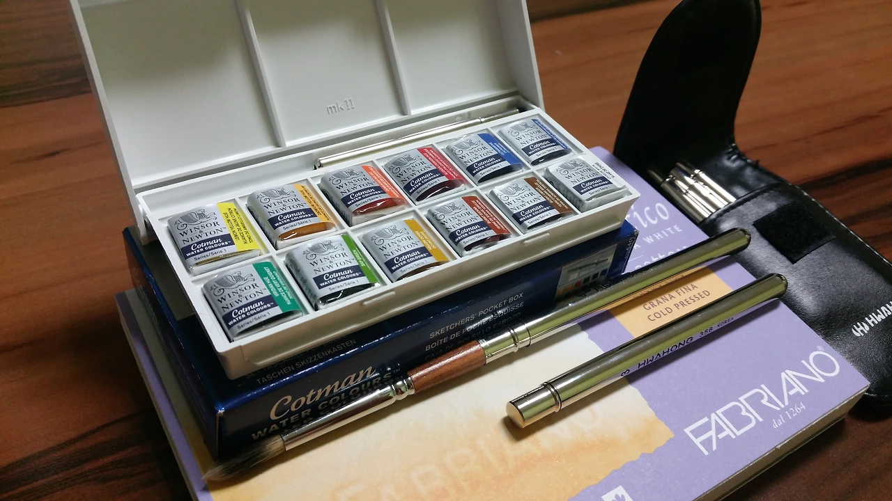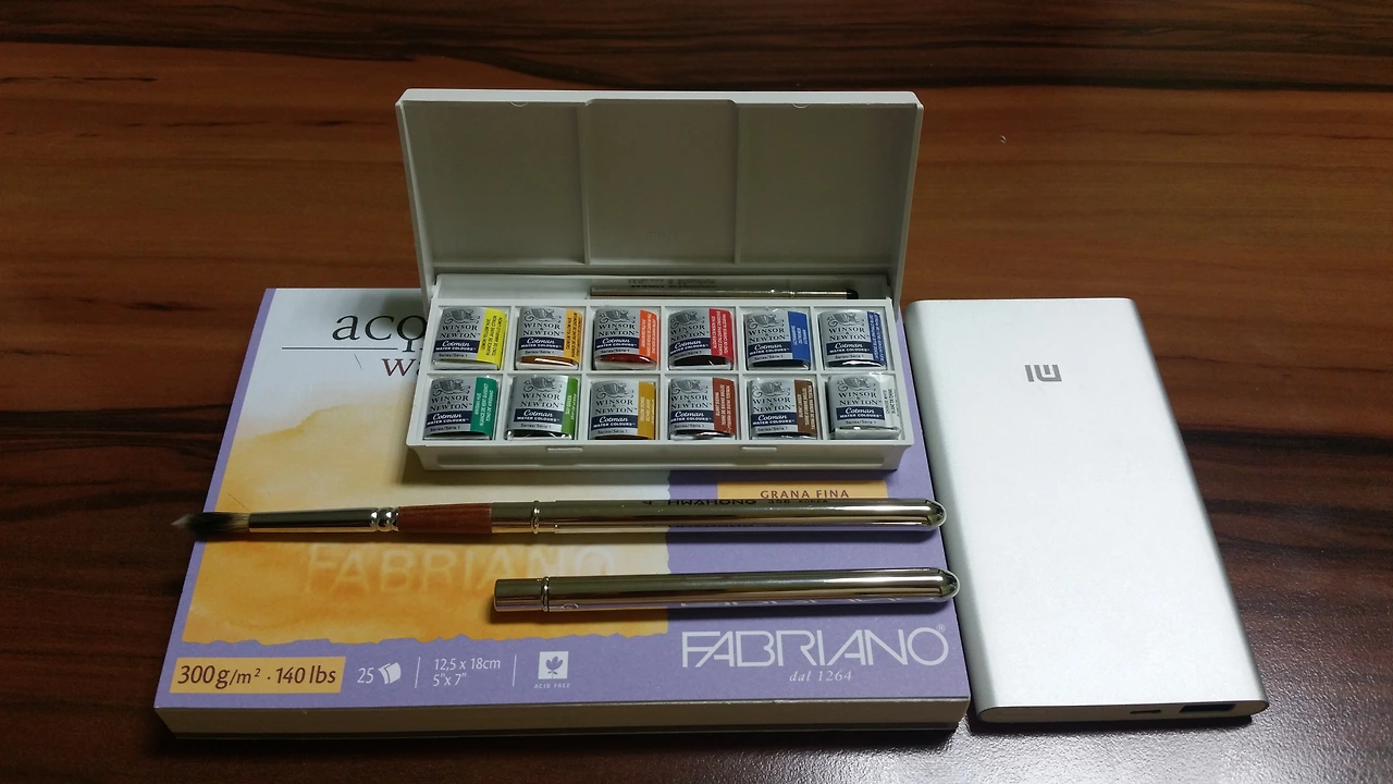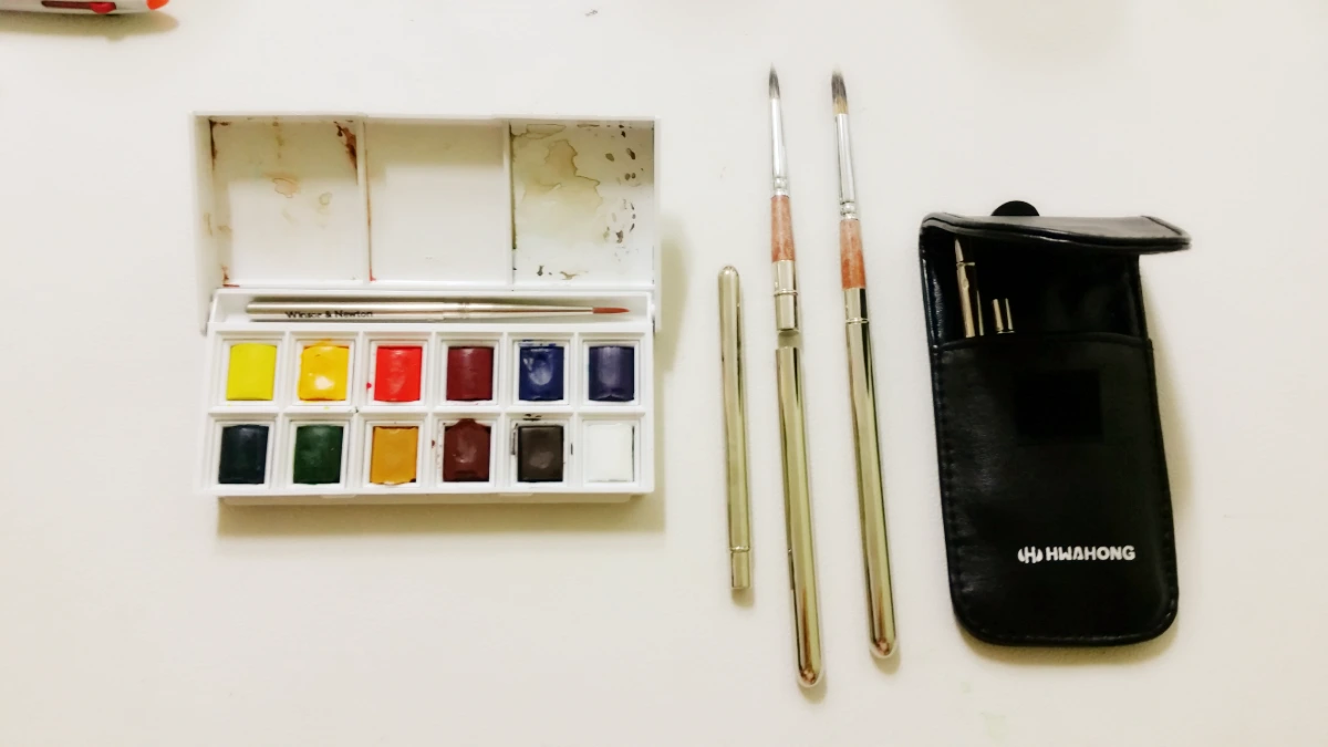 2) 휴대용 수채물감과 붓