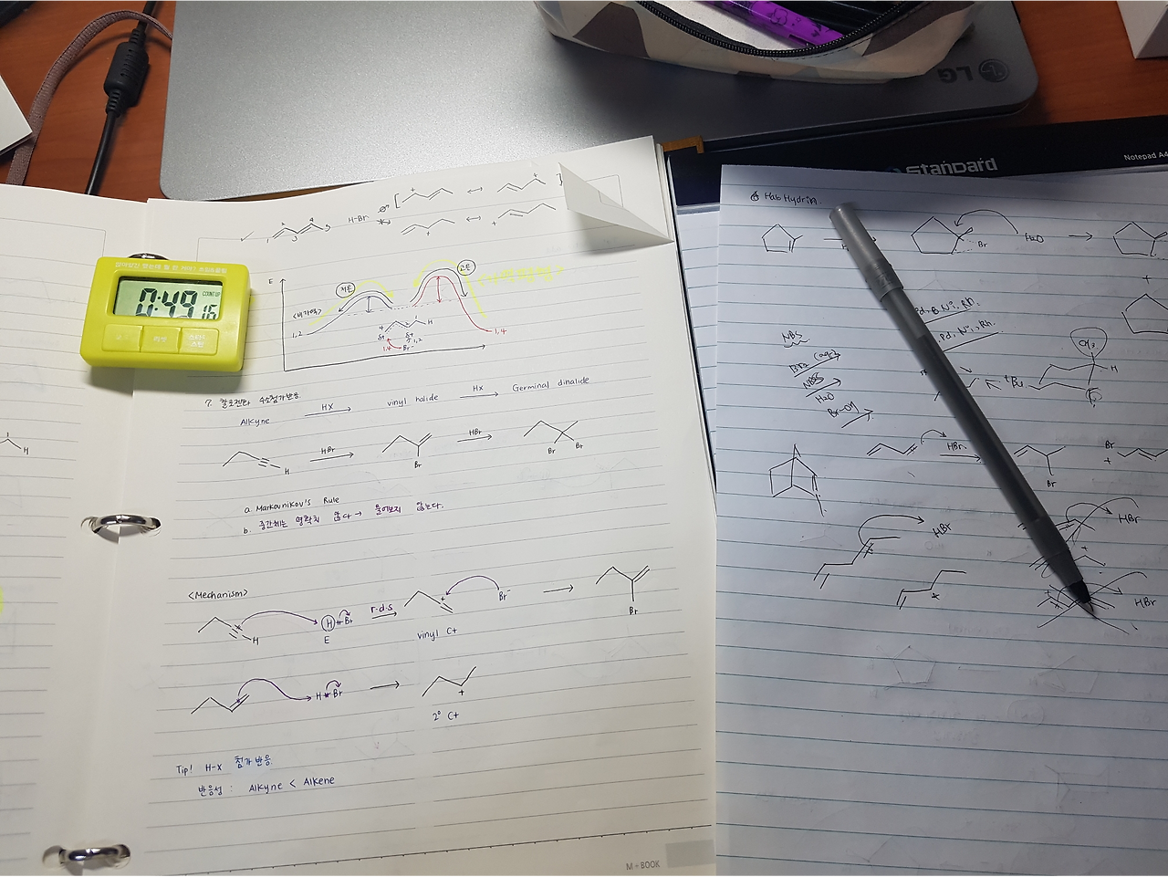 이 강사님 수업을 통해 유기화학에서 안정한 화합물일수록 에너지가 적게 나옴을 알 수 있었다. 처음에 에너지가 많을수록 힘이 강하다는 의미니까 더 강력해서 안정한 물질인 줄 알았던 여름시절의 내가 우스워진 순간이었다. 이 강사님 수업을 들으며 필기노트를 단권화해서 만들어나갔고 그 내용을 3월 기출문제 커리큘럼 전까지 7번 반복했다.