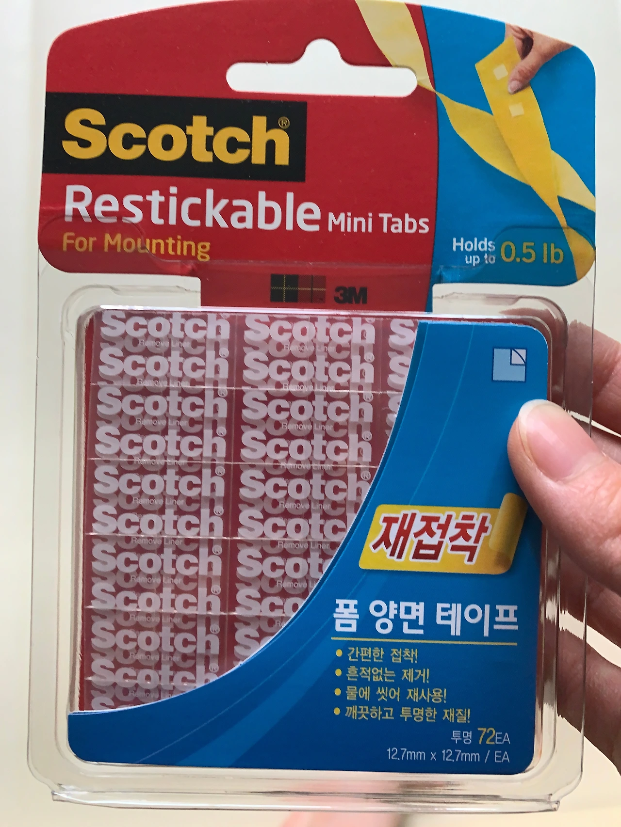 (재접착 양면테이프는 힘이 있는데 탈부착이 잘돼서 벽에 붙이기 좋다.)
