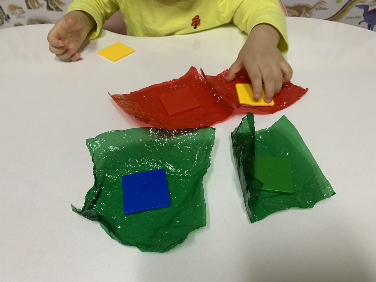 2. 셀로판지를 아이가 펼쳐보도록 하며 색상을 꺼내 볼 때 셀로판지와 다른 색이 나오면 “다르다”, 셀로판지와 같은 색이 나오면 “똑같다” 말하며 색상의 이름을 말해준다.