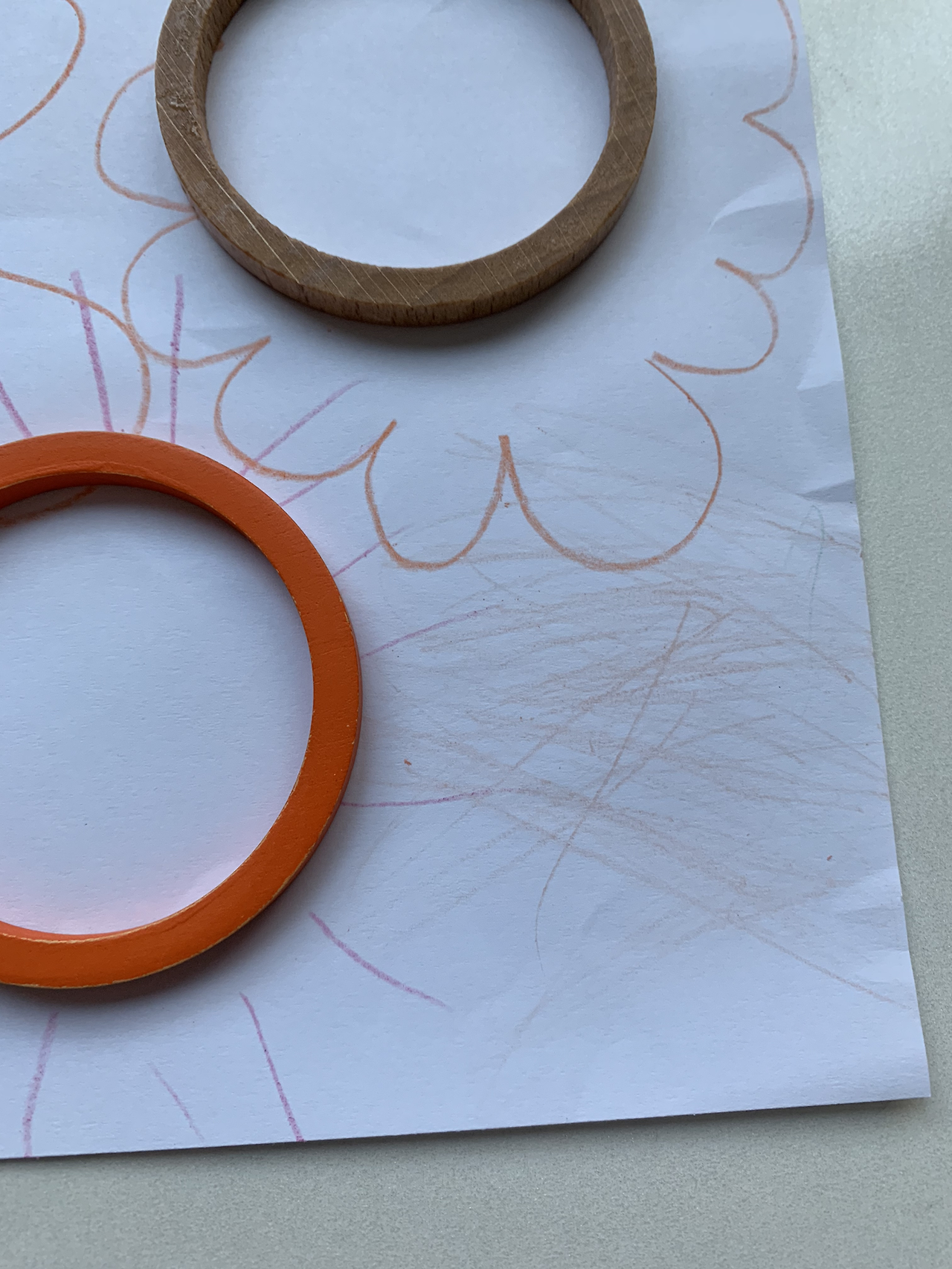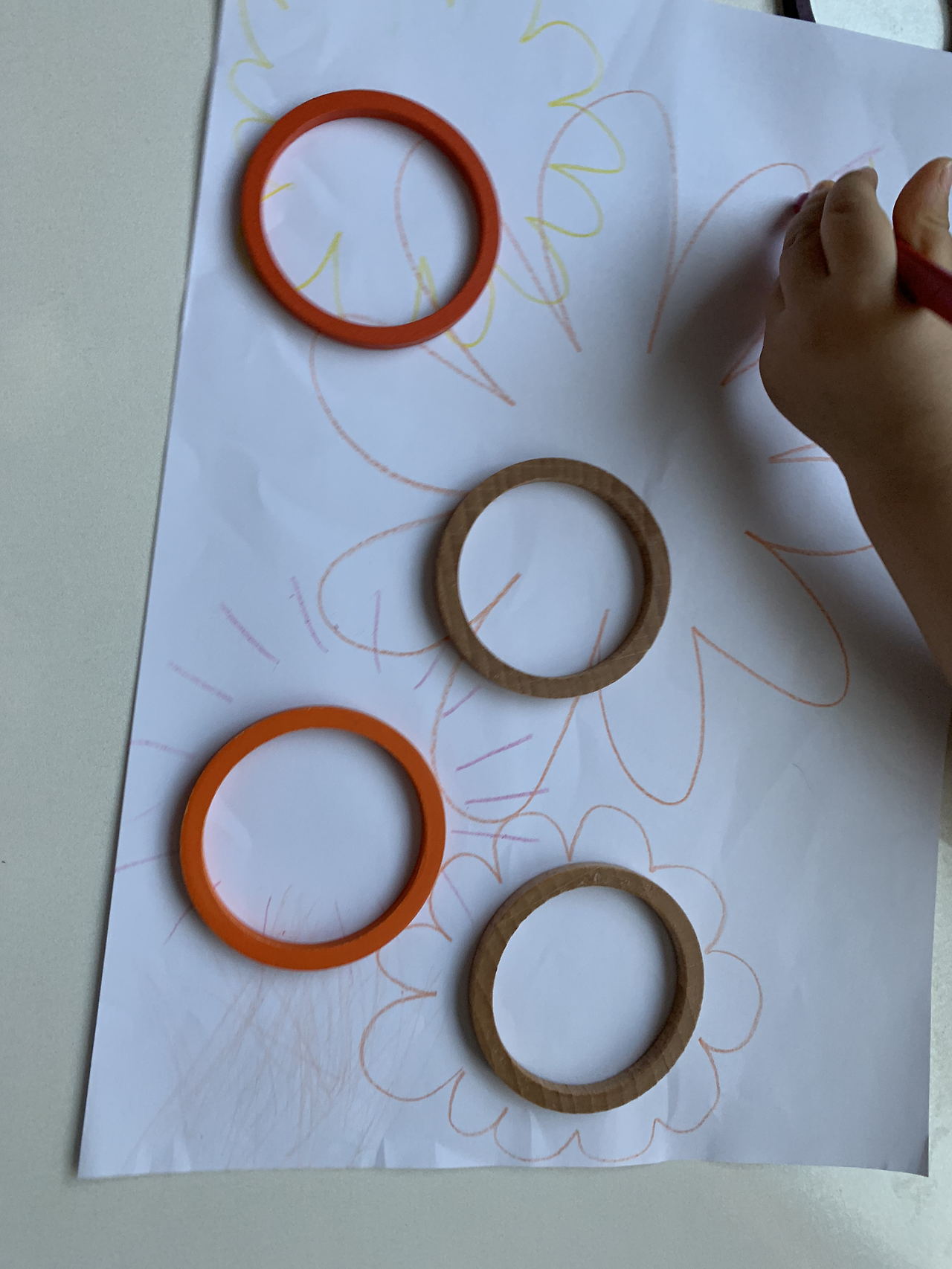 2. 아이가 놓은 가베의 안쪽을 색연필로도 그린 후 떼보며 동그라미라고 얘기해준다.