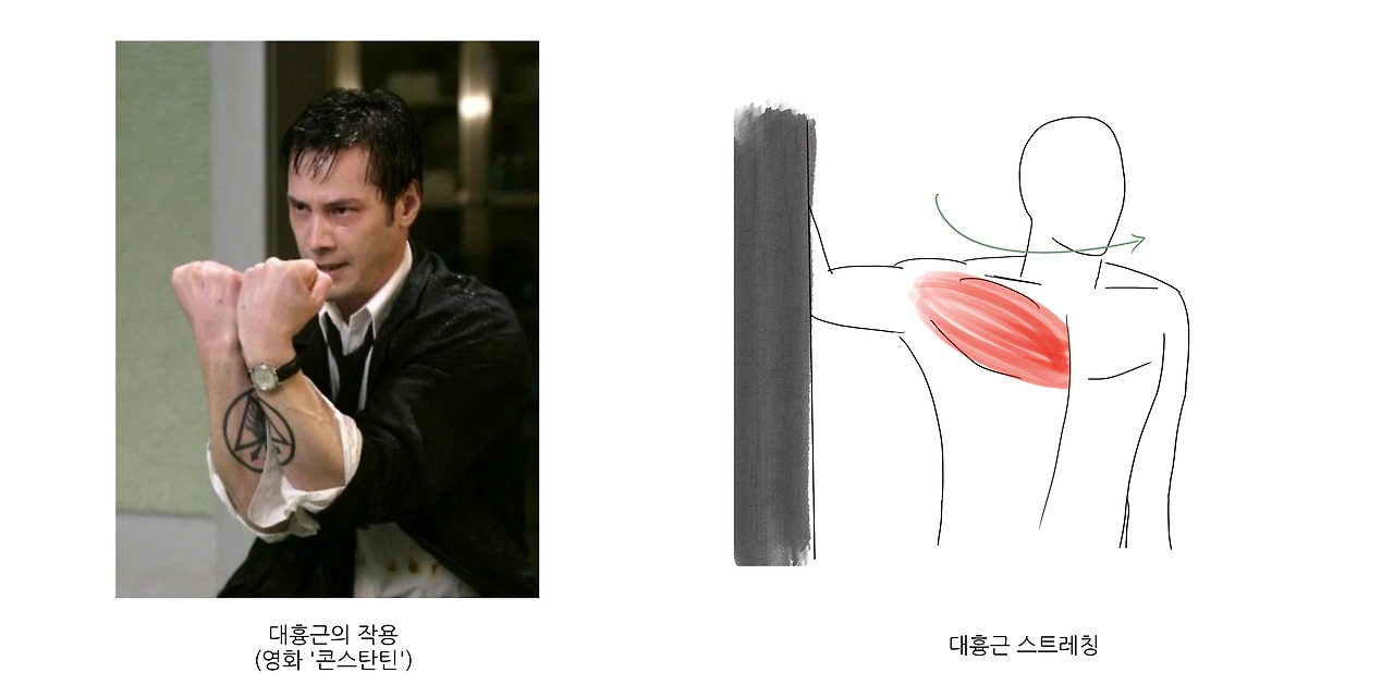 대흉근의 팔을 몸의 중앙쪽으로 모으고(Horizontal adduction), 안쪽으로 회전시킨다(Internal rotation). 영화 '콘스탄틴'에서 키아누 리브스가 보여주던 그 자세를 하게 해주는 근육이다. 타이트해지면 라운드숄더(Round shoulder)의 한 원인이 된다.