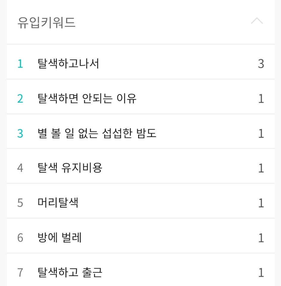 하긴 나도 탈색을 하기 전에 정말 어마어마한 검색을 했었다. 탈색하면 머리가 녹아서 끊어질 수도 있다는데 진짜로 해도 되는 것인지, 회사를 다니는데 탈색을 해도 짤리지 않을지, 미용실에서 탈색하기엔 너무 비싼데 셀프탈색을 하면 안 되는지 등등 탈색을 직접 하기 전까지 매일매일 인터넷을 들락거리며 정보를 찾고 또 찾아보았다. 그래서 그냥 웃어넘기려다 7일간의 유입키워드에 적힌 검색어에 대한 주관적인 답글을 달아보기로 했다. 지금도 탈색을 해야 할지, 말아야 할지 고민하느라 밤을 꼴딱 지새우고 있을지도 모르는 영혼들에게 자그마한 1 도움이라도 되기를 바라며.