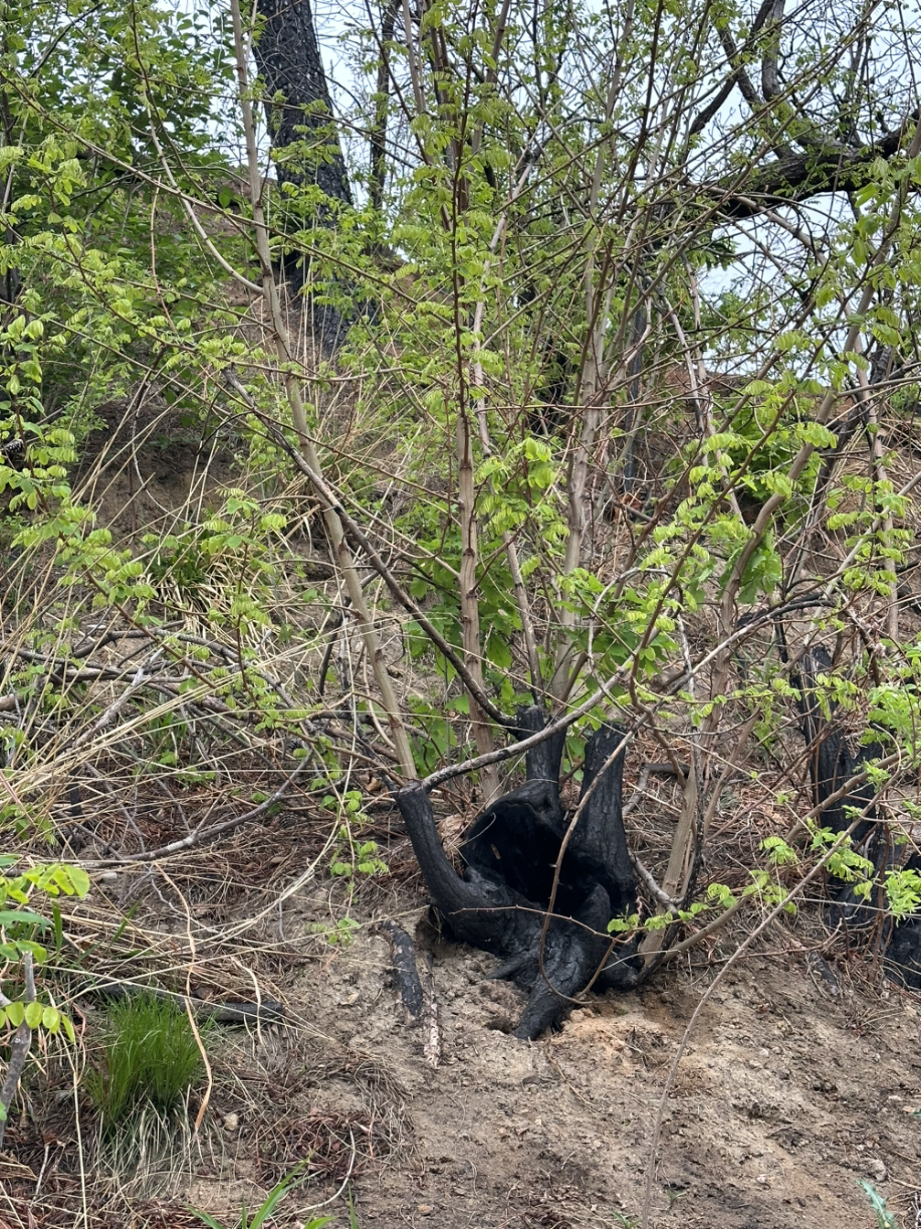 불 탄 그루터기에서 자란 연녹색 나뭇가지
