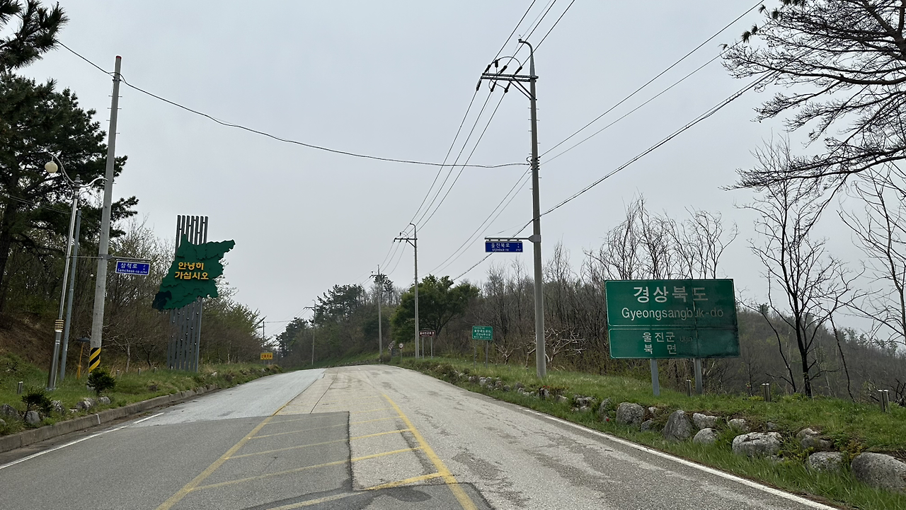 호산항에서 하룻밤을 보내고 다시 길에 나선다. 다행히 어제 저녁 흩뿌리던 비는 멈췄고 봄비에 선선해진 날씨가 걷기에 딱 좋은 환경을 만들어 주었다. 부지런히 산길을 걸어 지방도의 정상에 도착했다. 강원도 삼척과 경상북도 울진의 경계지점이다. 여행을 시작하고 처음으로 도경계를 넘게 되었다. 지난가을 시작한 해파랑길 여행이 300km를 넘어 절반이 되어가고 있다. 언덕배기에서 잠깐 경계표시를 쳐다보다 다시 길을 재촉한다.
