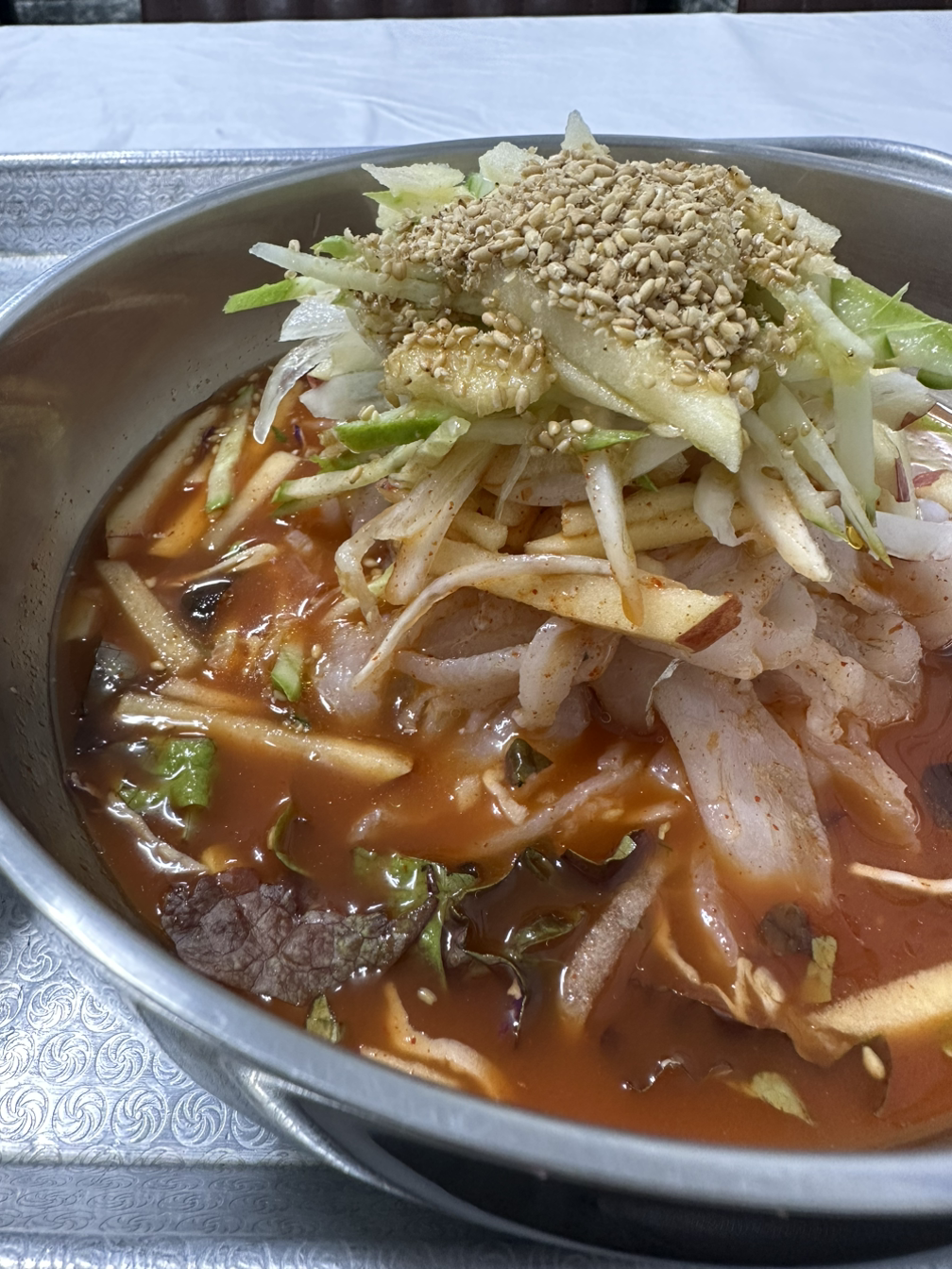 아침에 먹은 라면과 산속에서 먹은 간식도 뱃속에 더 이상 남아있을 리 없는 오후, 임원항에 도착했다. 뭘 먹을까 고민하다가 일단 임원항을 좀 둘러보고 메뉴를 결정하기로 했다. 임원항은 어제 궁촌항보다는 훨씬 큰 항구이고 관광객도 상당히 많은 곳인지 항구로 가는 길에 식당도 즐비하다. 이제 식당을 골라야지 생각하는 순간 손님이 없었는지 아련한 눈빛을 건네시며 호객 아닌 호객을 하는 아주머니의 눈에 이끌려 작은 횟집에 들어간다. 주문한 물회가 나오는 순간, “잘 들어왔구나! 맛 볼 필요가 없을 것 같다”라는 생각을 하며 만족스러웠다. 비주얼 못지않게 물회맛도 그만이었다. 회는 국수마냥 길고 넓적했고, 무엇보다 싱싱했다. 맵고 짜고 시큼하고 달짝지근한 초장도 적당해서 물회의 맛을 더했다. 무엇보다도 쌓아 올린 회가 더미라고 표현해도 될 만큼 만족스러웠다. 회를 조금 덜어 먹은 뒤에야 밥을 말아 제대로 된 물회를 즐길 수 있었다.(얼마나 만족스러웠는지 몇 주 뒤 근처로 가족여행을 와서 한 번 더 들렀었다.)